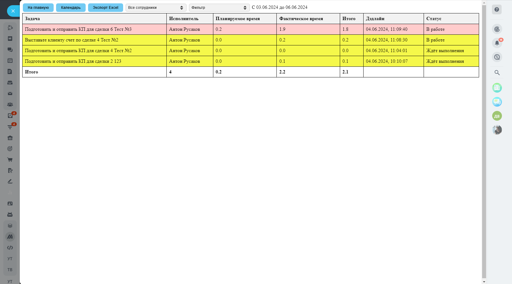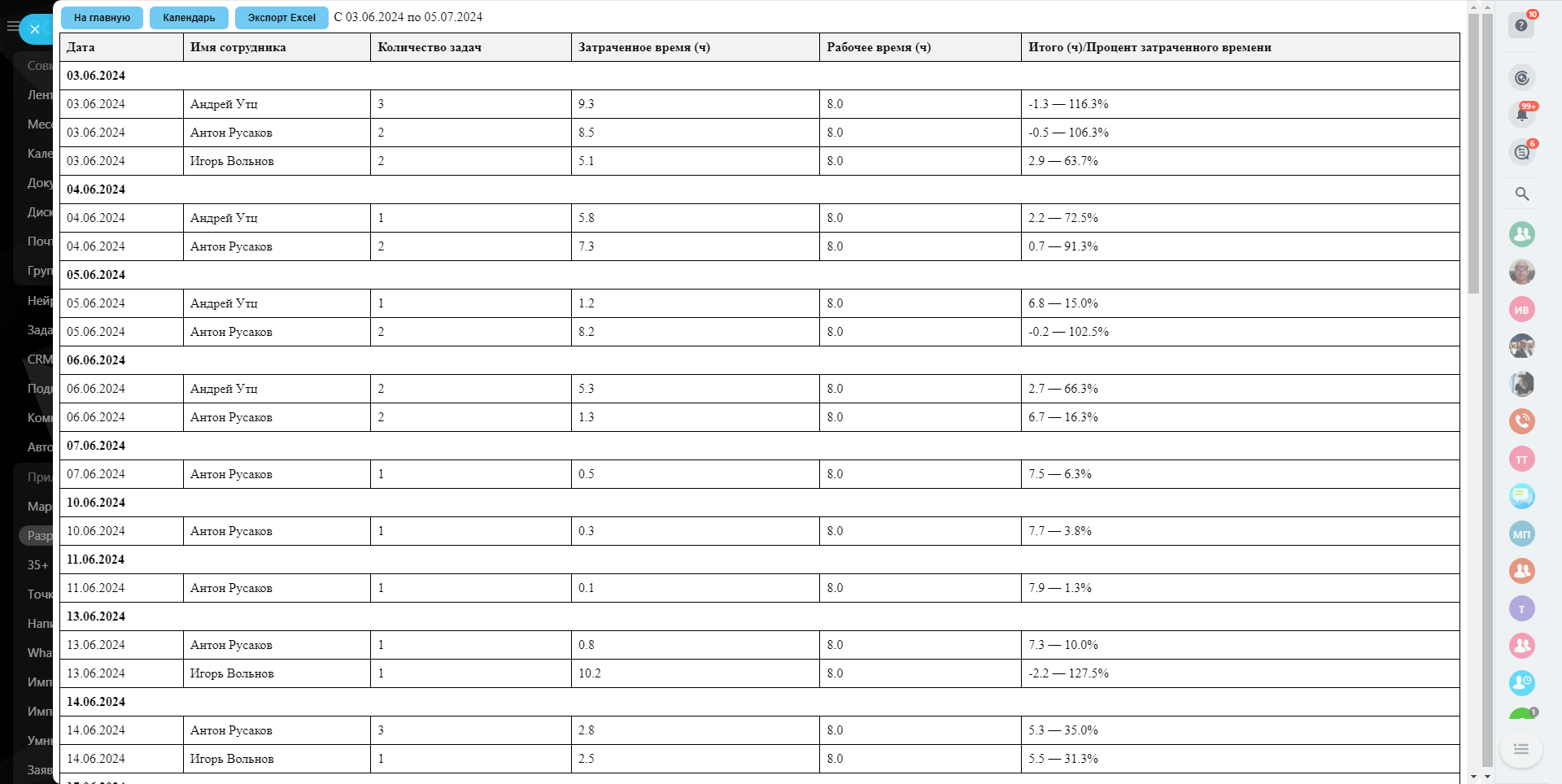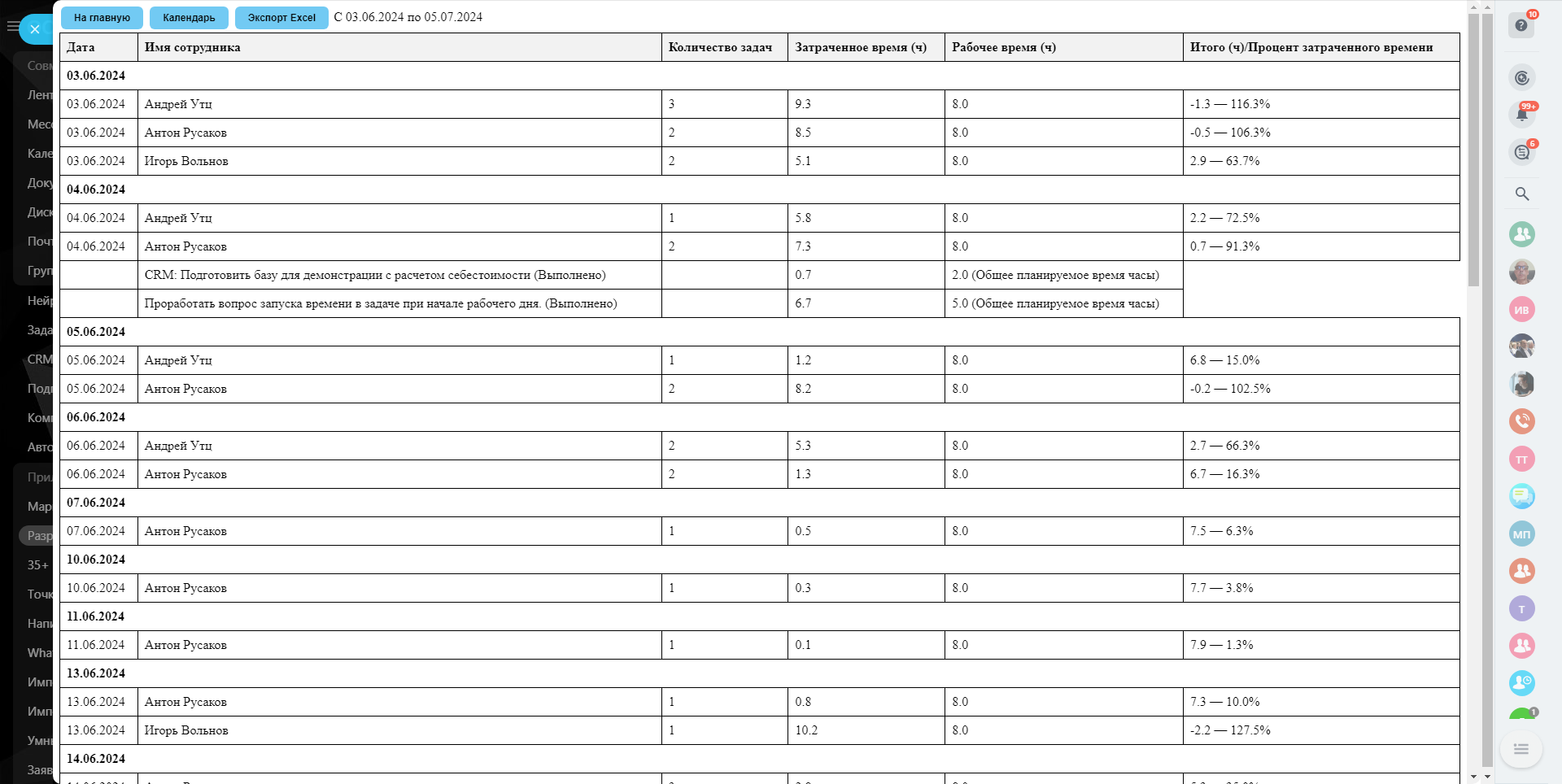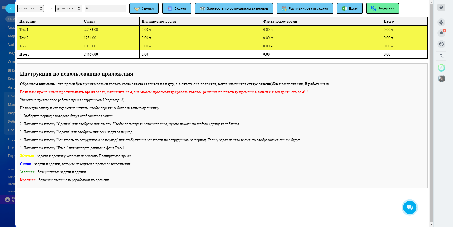 Приложение предназначено для удобного управления задачами в Вашей CRM-системе. С его помощью Вы сможете легко отслеживать и анализировать задачи и занятость сотрудников за выбранный период времени. Также предусмотрена возможность экспорта данных в формат Excel для последующего анализа и отчетности.