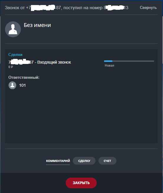 - создавать лидов автоматически, при входящем вызове с неизвестного номера