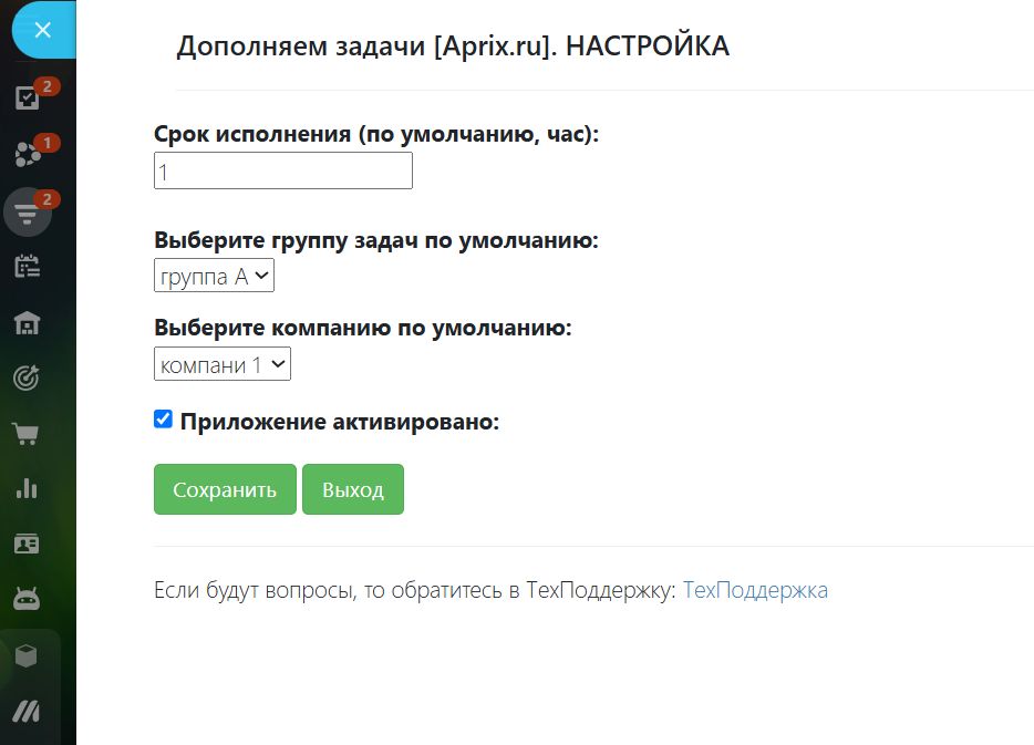 Приложение для удобства при заведении новых задач, сокращения рутинной работы по установке типовых параметров задачи. Также часто бывает, что у менеджеров теряются задачи, и, чтобы этого избежать, нужно добавить в задачу CRM элемент и крайнюю дату, если она не задана. После чего менеджер будет всегда видеть данную задачу в "Моих делах". CRM элемент и крайняя дата могут быть настроены для приложения, чтобы задача отмечалась в нужных местах, для этого существует вкладка с настройками приложения. Настраиваемый элемент CRM – это пока только компания, в последующих версиях, возможно, будут предложены для выбора и другие сущности, используемые в задачах.