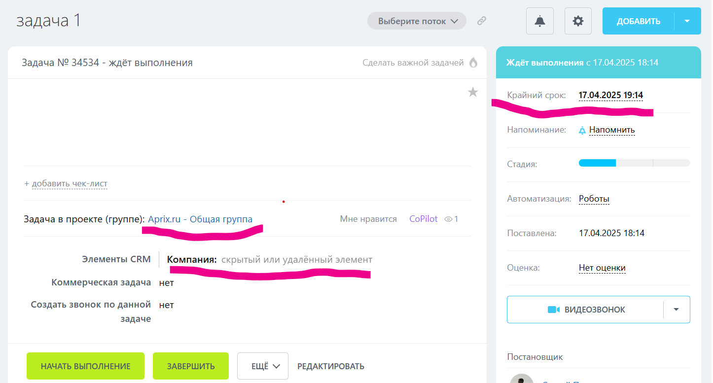 Приложение для удобства при заведении новых задач, сокращения рутинной работы по установке типовых параметров задачи. Часто бывает, что у менеджеров теряются задачи и, чтобы этого избежать, нужно добавить в задачу CRM элемент и крайнюю дату, если она не задана. После чего менеджер будет всегда видеть данную задачу в "Моих делах".