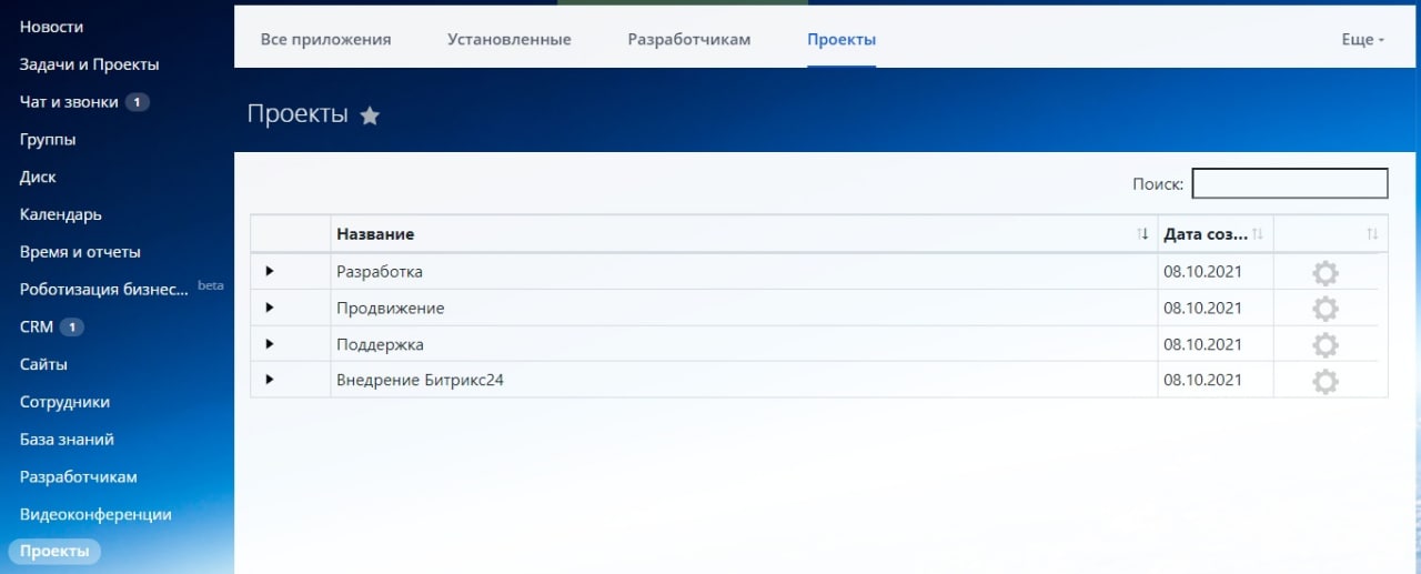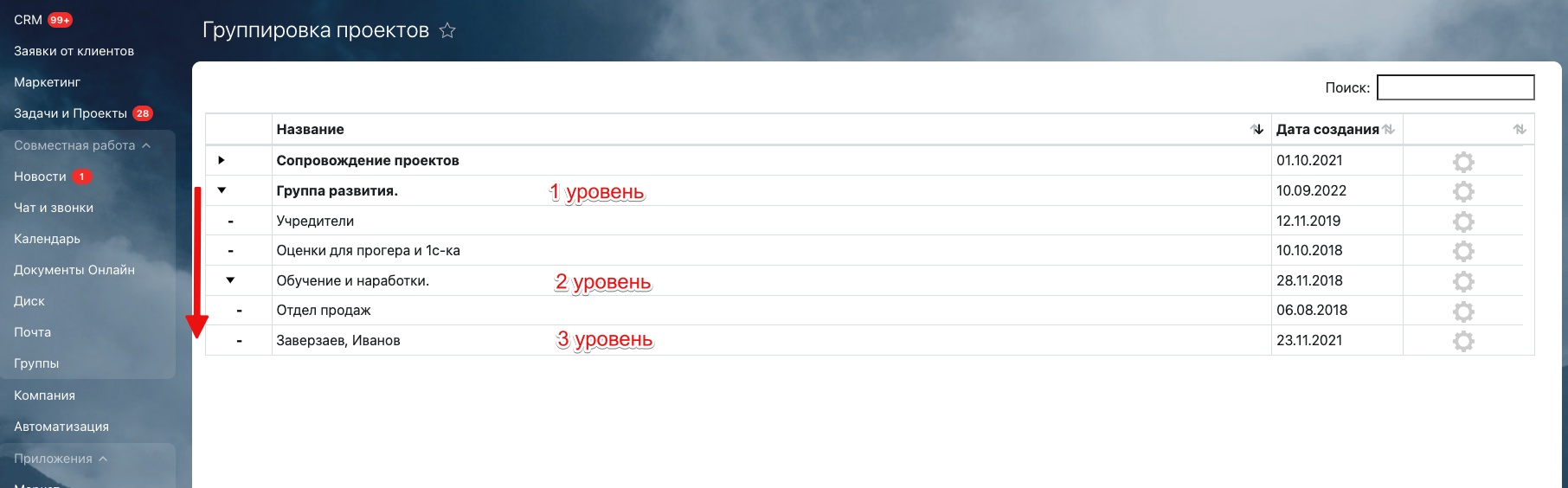 Одним из вариантов составление структуры можно сделать разделение проектов по типам. К примеру, проекты отдела продаж, проекты производства. Для этого необходимо создать соответствующие проекты (группы), которые станут родительскими, и дочерними привязать существующие проекты.