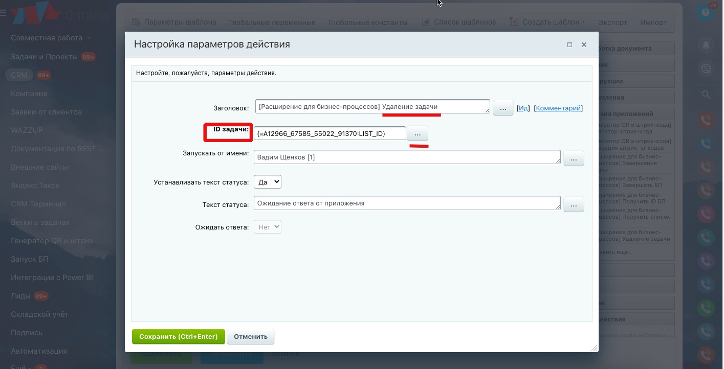 -ID задачи (надо выбрать поле или переменную, где хранится ID задачи, которую необходимо удалить. Узнать ID задачи, можно с помощью другого активити, которое входит в этот набор. Обязательно для указания)