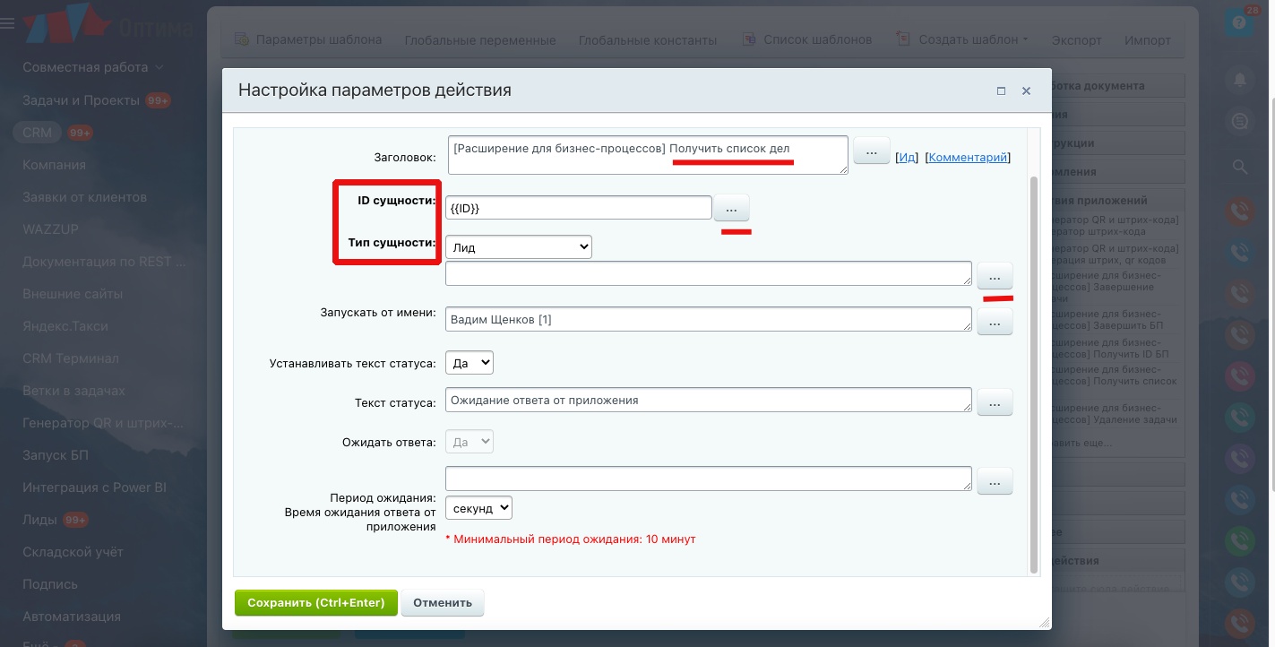 -ID сущности (надо выбрать поле или переменную, где хранится ID сущности, по которой необходимо получить список дел. Обязательно для указания)