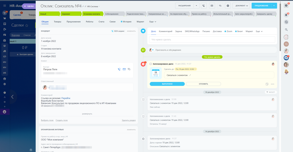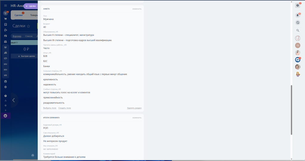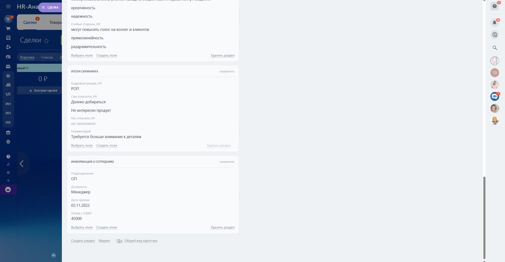 В карточки «Контакты» - убрали все лишнее, оставили только контактную информацию и добавлен тип контакта - Соискатель (HR)