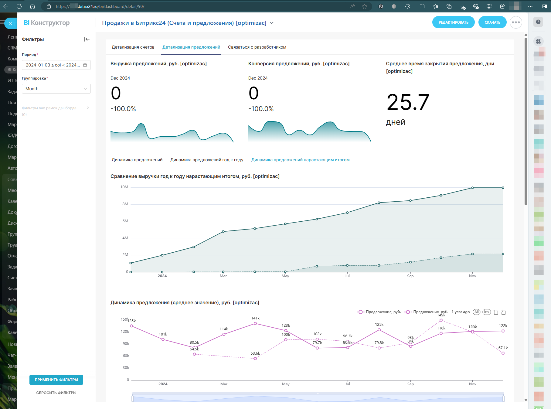 - Выручка предложений - динамика, год к году, нарастающим итогом, конверсия и средний чек.