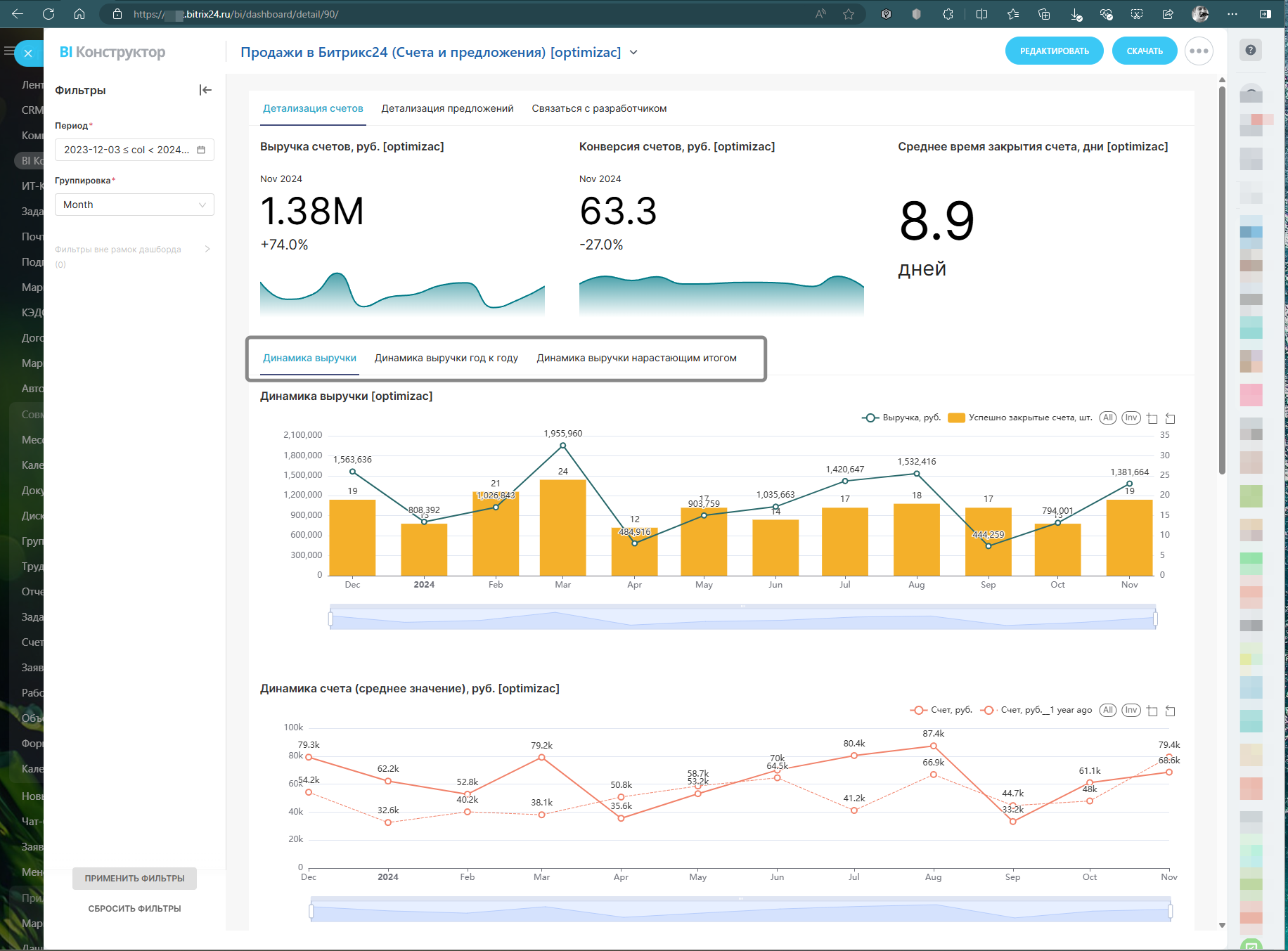 - Выручка счетов - динамика, год к году, нарастающим итогом, конверсия и средний чек.