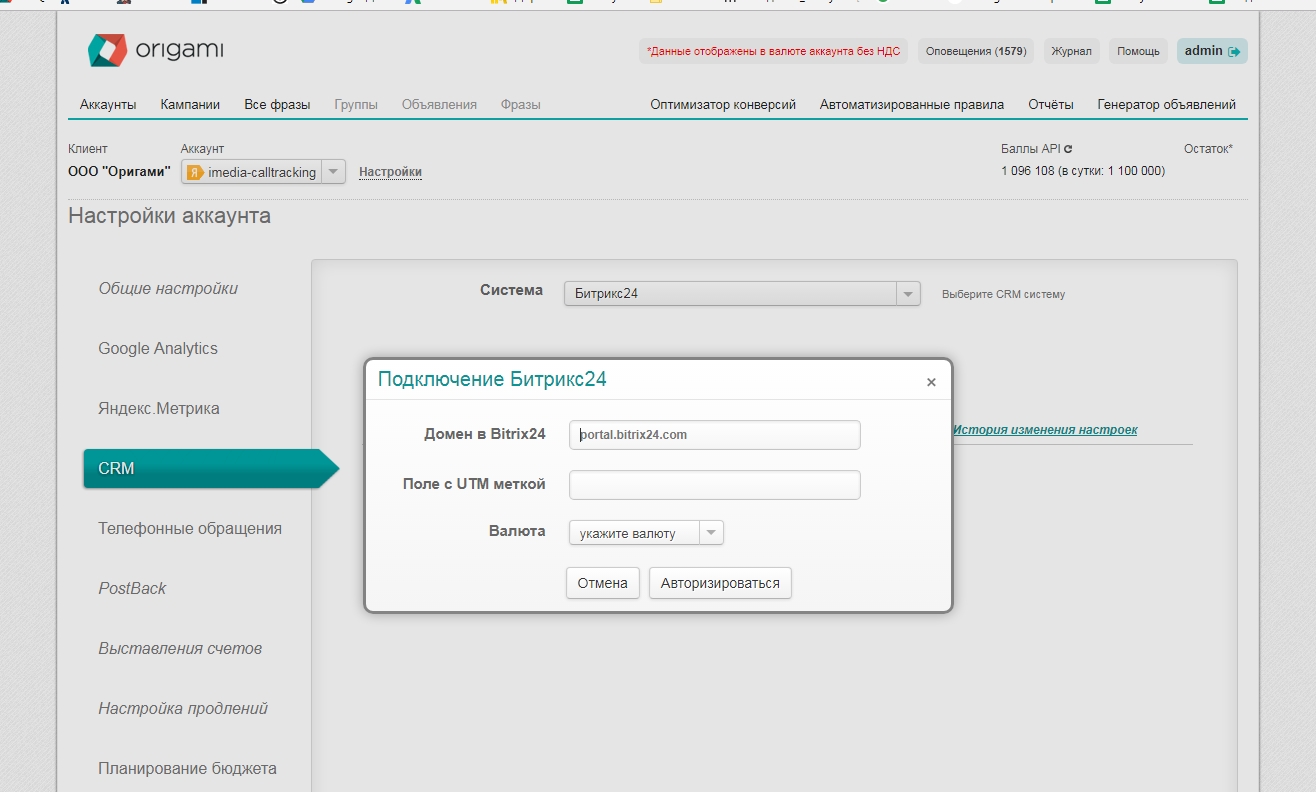 С помощью данного приложения происходит интеграция Origami и CRM Bitrix24. Вы сможете видеть в интерфейсе Origami сделки CRM, привязанные к вашим рекламным кампаниям, объявлениям и фразам.