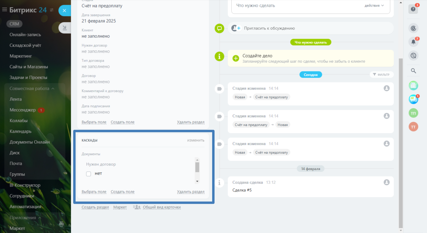 Открываем необходимую карточку в CRM и создаем новое поле с типом “Каскад” (в смарт-процессах через интерфейс создания дополнительного поля).