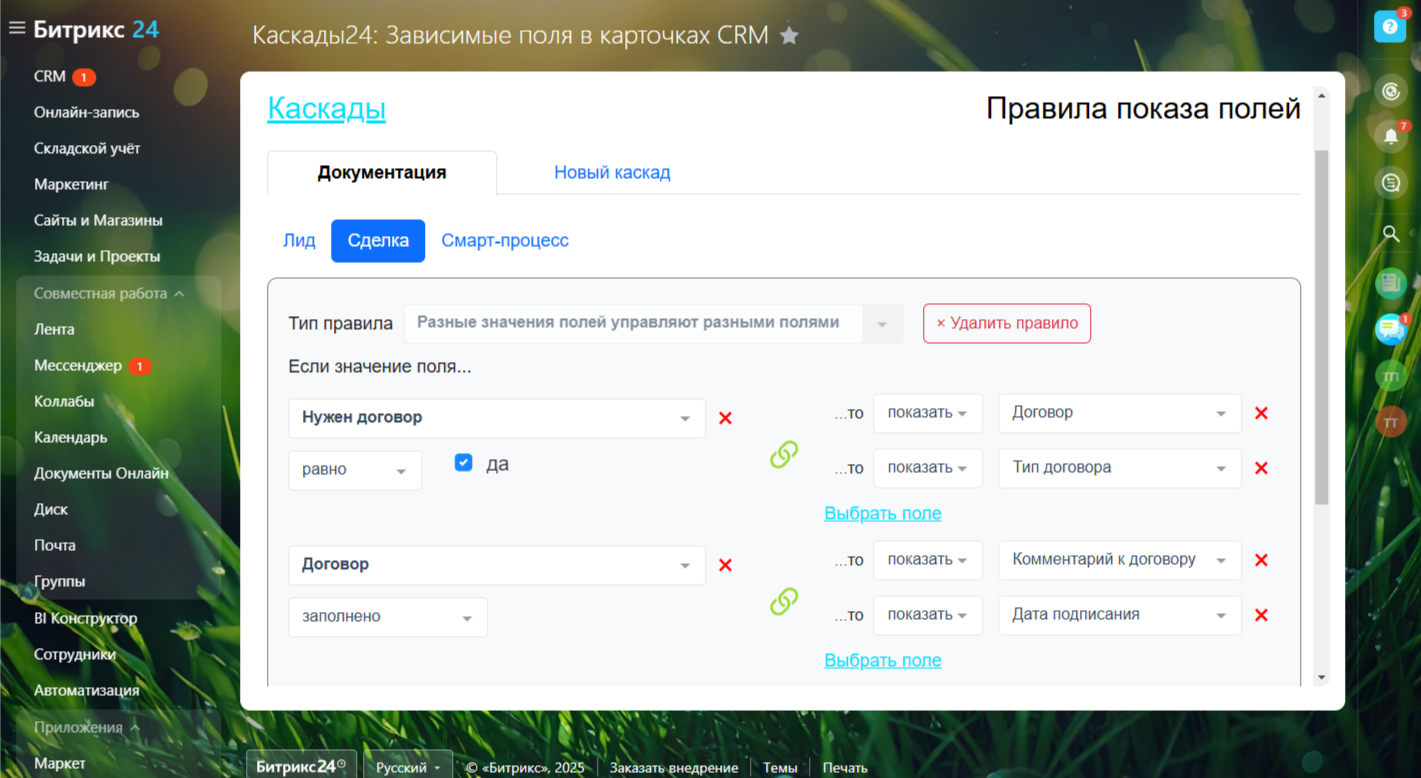 Следующим шагом мы переходим в раздел “Правила показа полей”, выбираем тип правила и настраиваем зависимости.