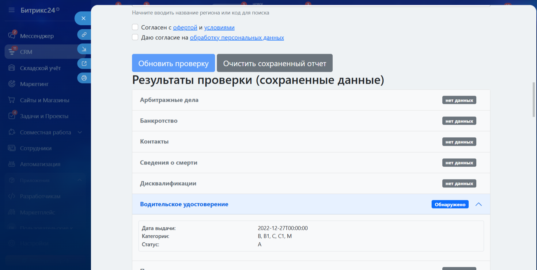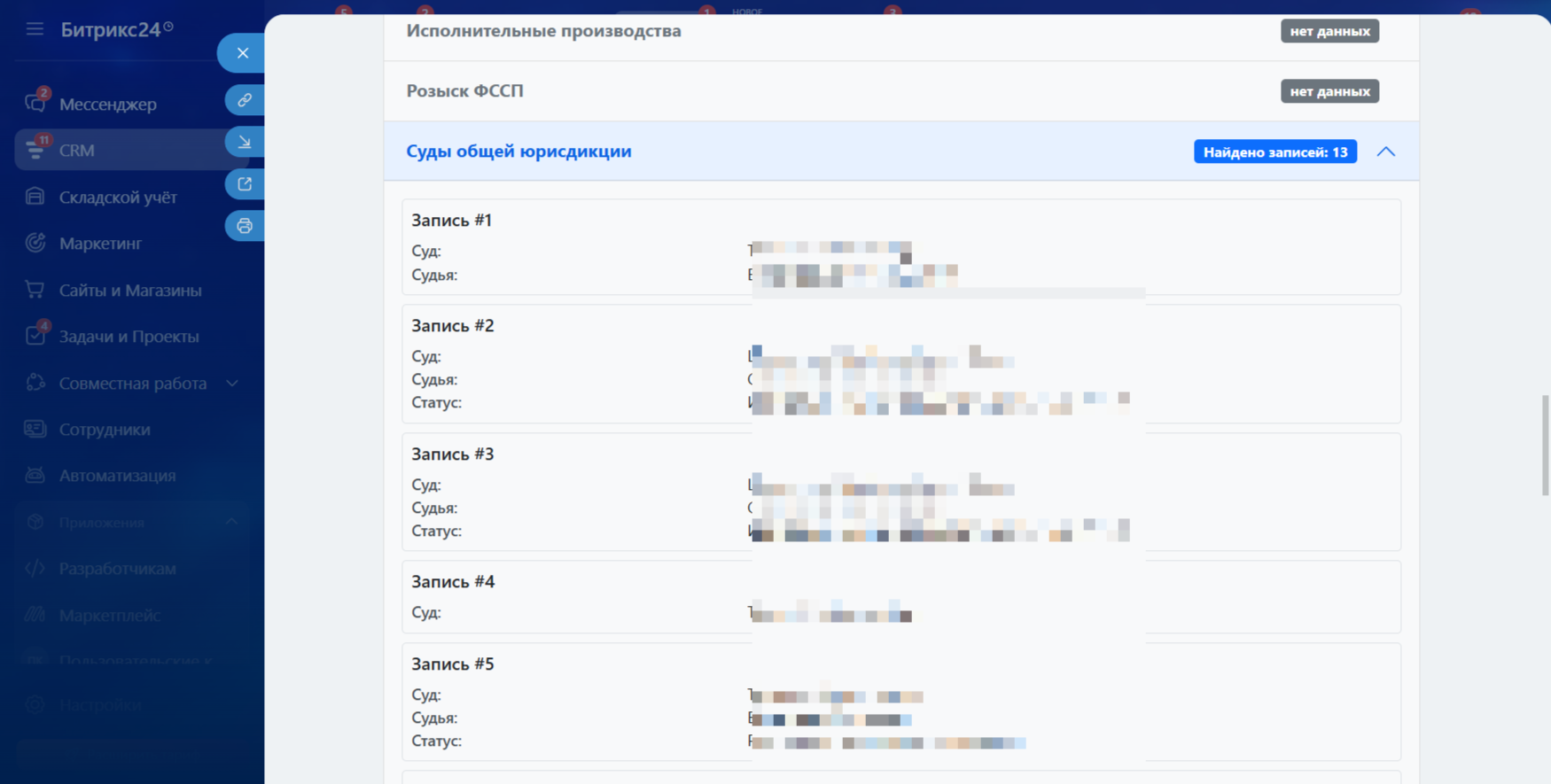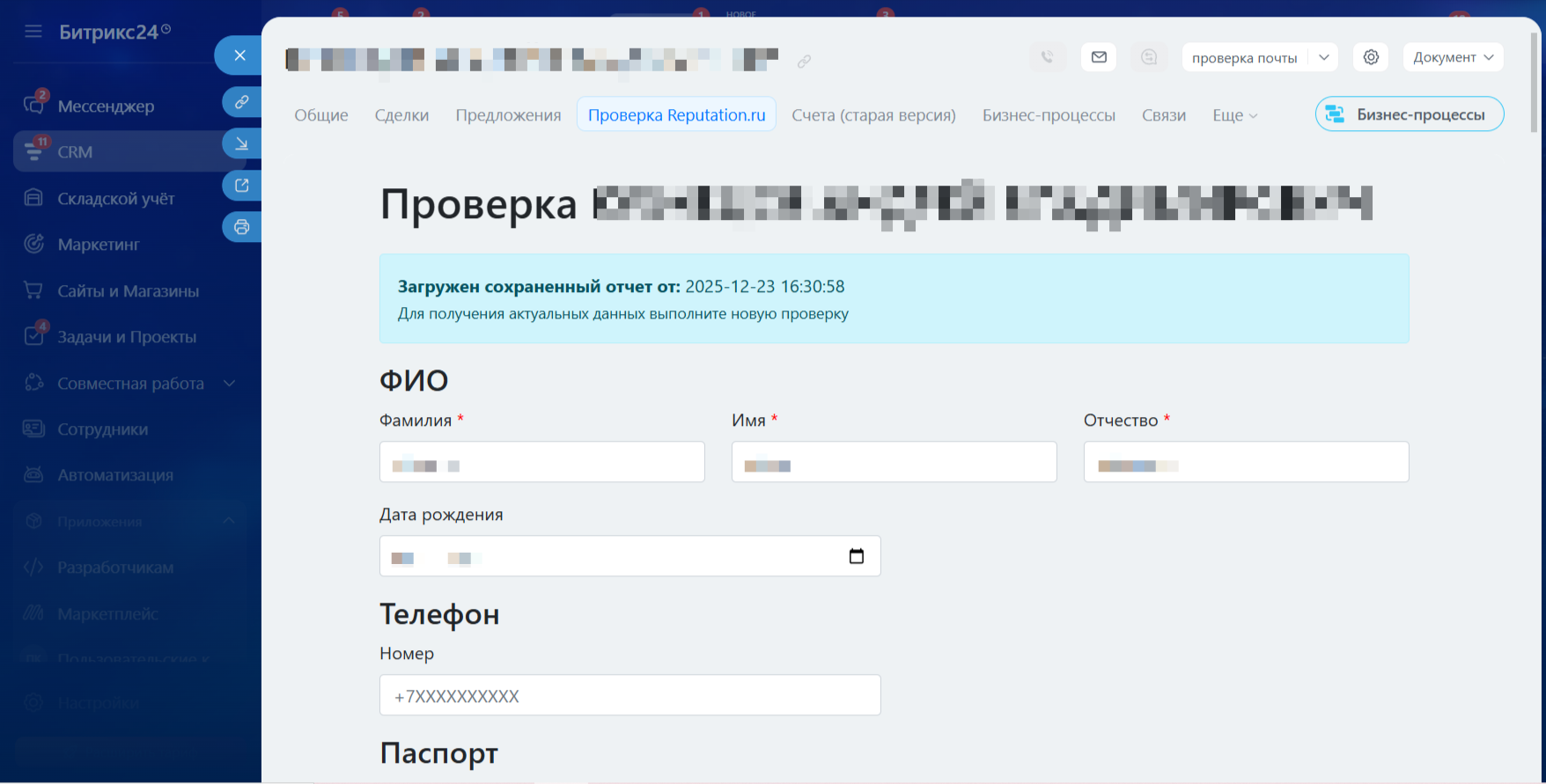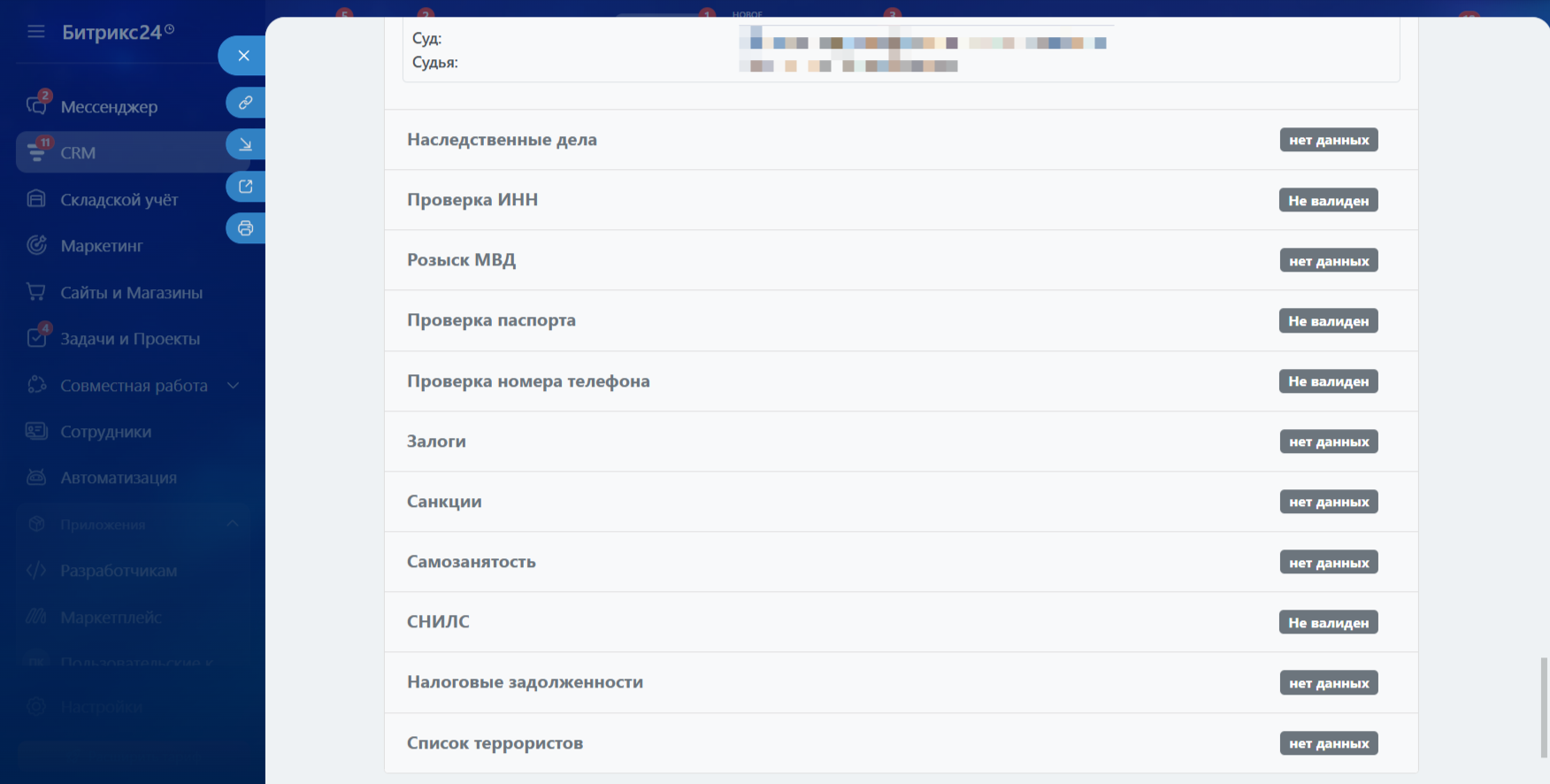 С помощью приложения “Интеграция с Reputation - Проверка физ. лиц” вы можете получить следующую информацию: