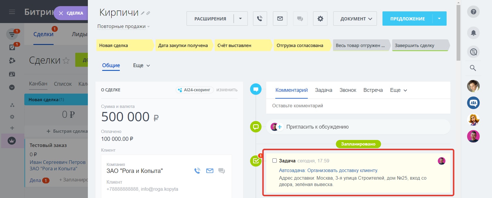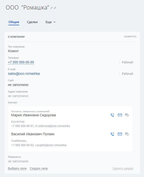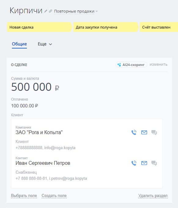 - карточки клиентов и сделок;
