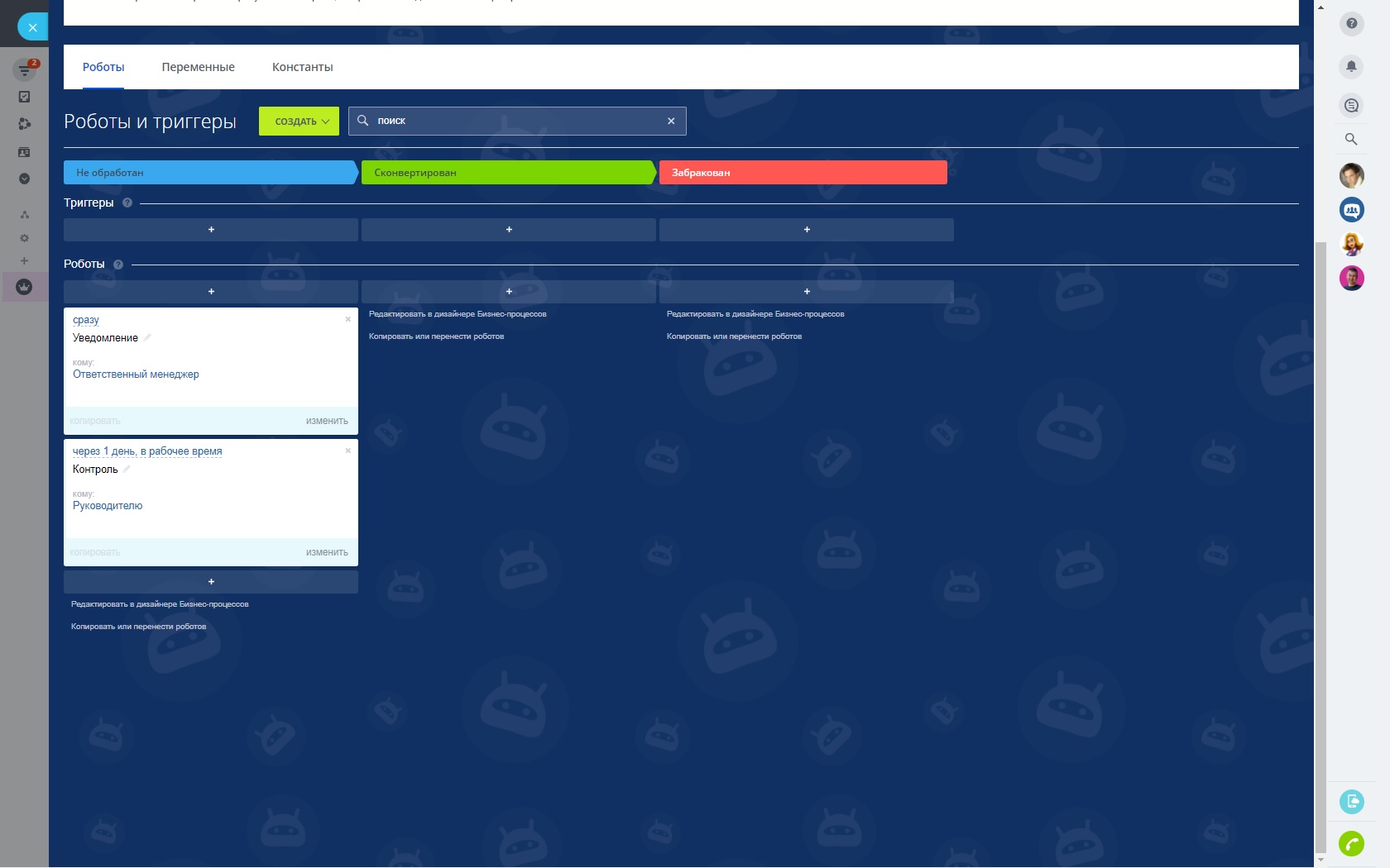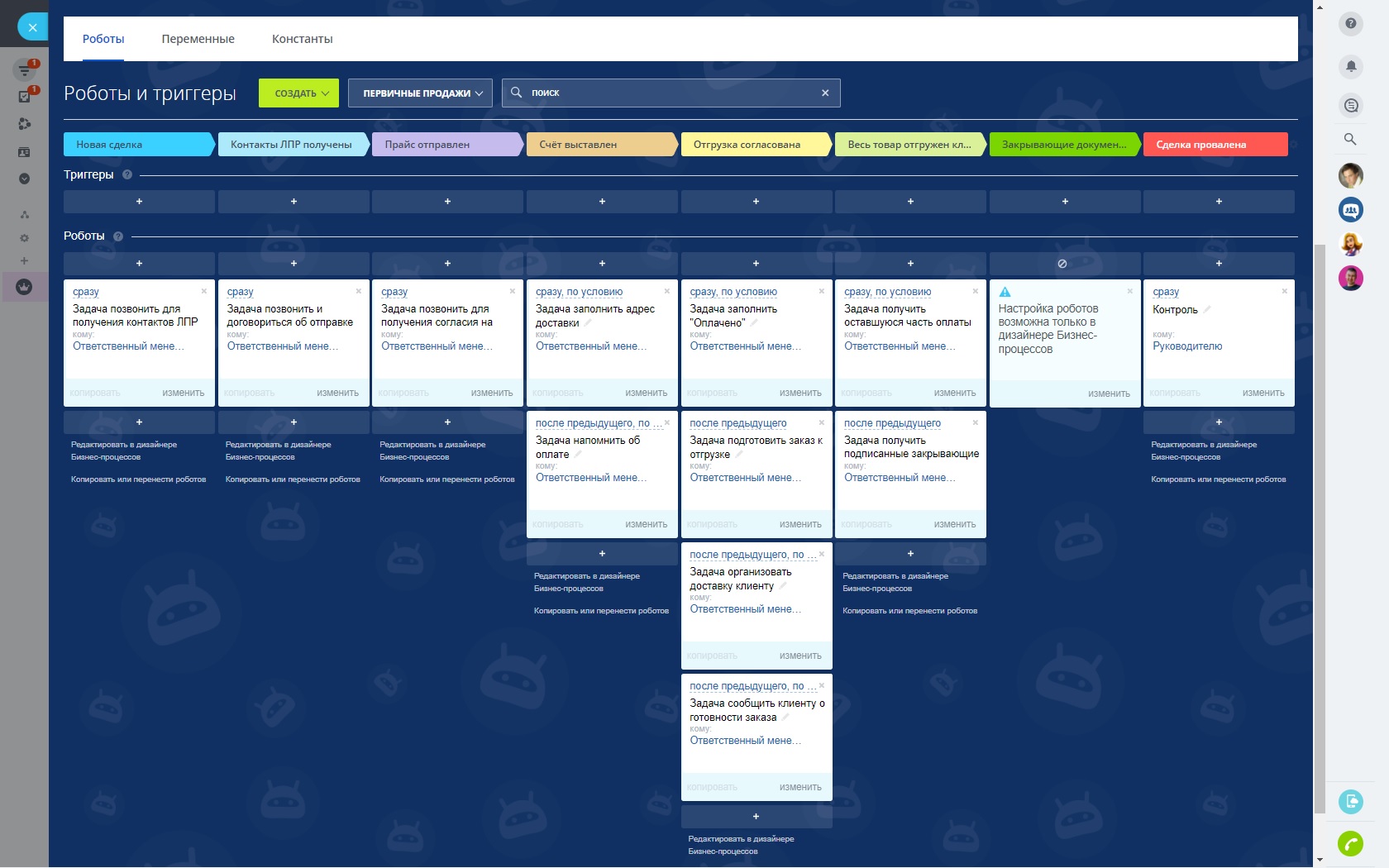 - автоматическая постановка задач менеджерам в зависимости от стадии;