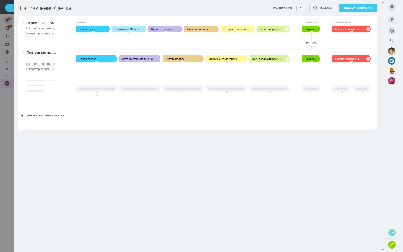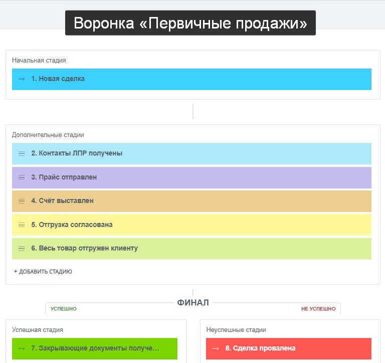 - воронка для ведения первичных продаж;