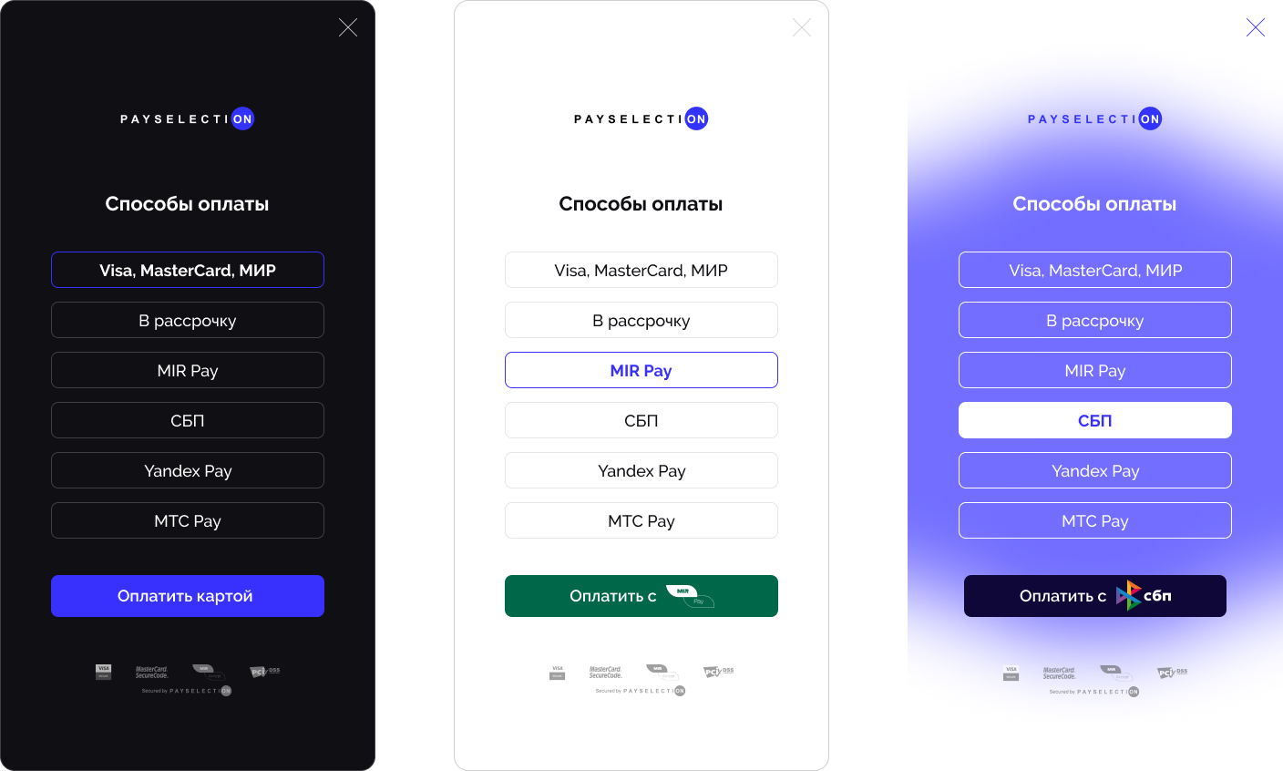 Платежный модуль PAYSELECTION для приема быстрых и удобных оплат на вашем сайте всеми популярными методами: VISA, MASTERCARD, МИР, UNIONPAY, YANDEX PAY, МТС PAY, MIR PAY, СБП, QR-код