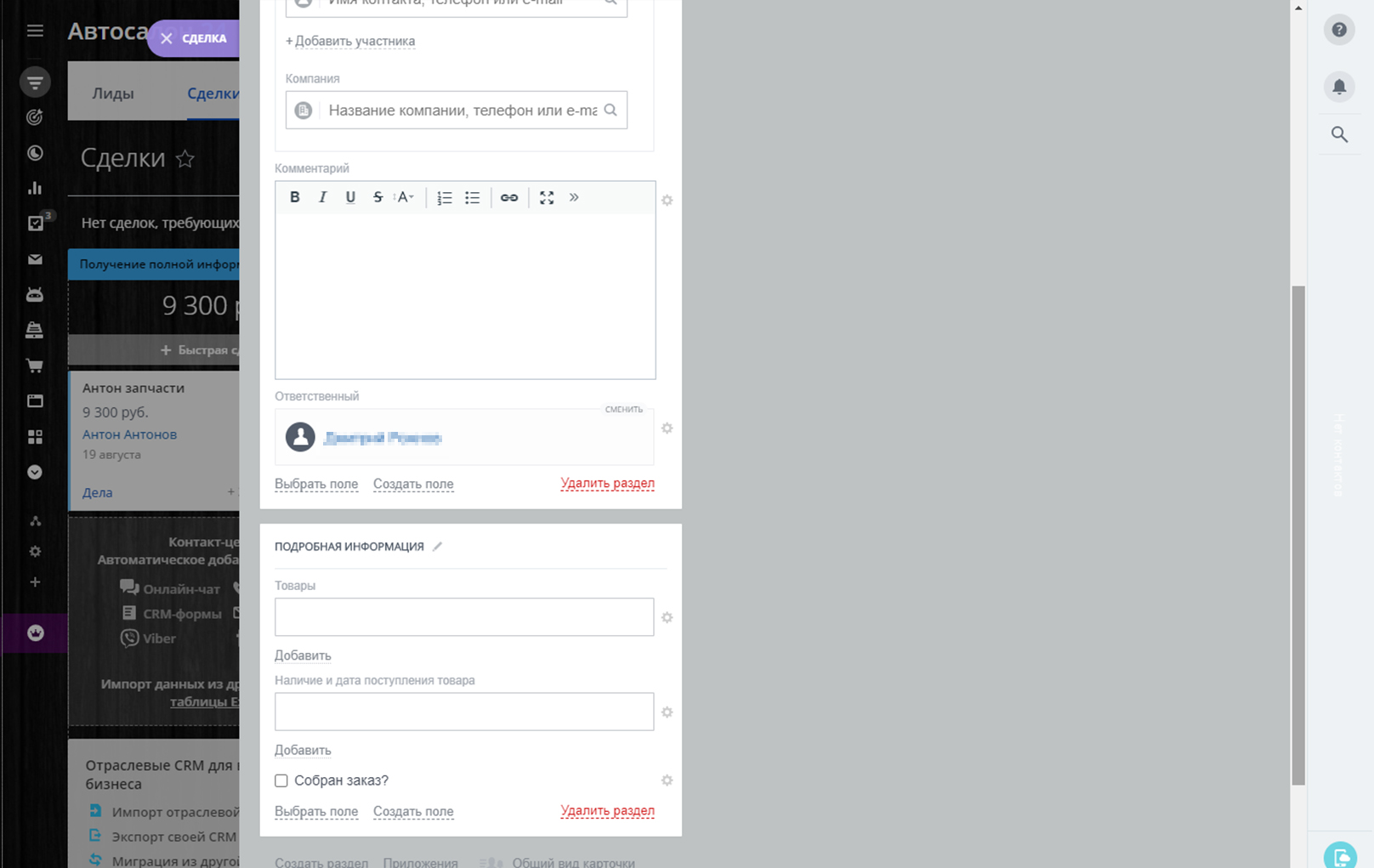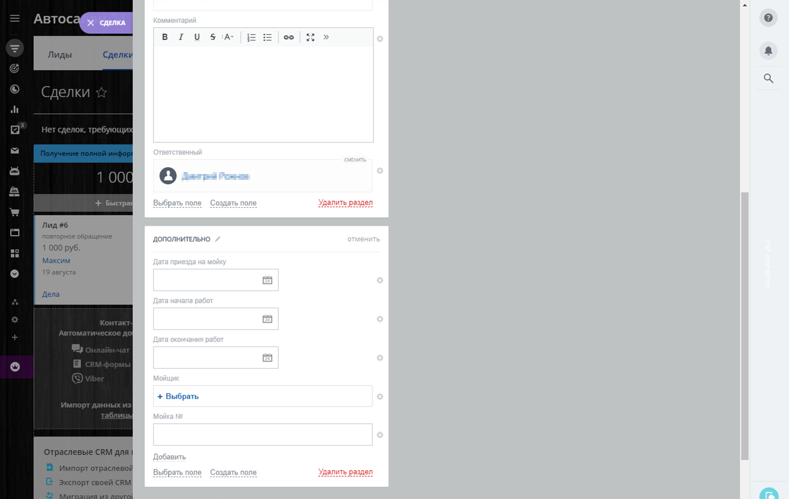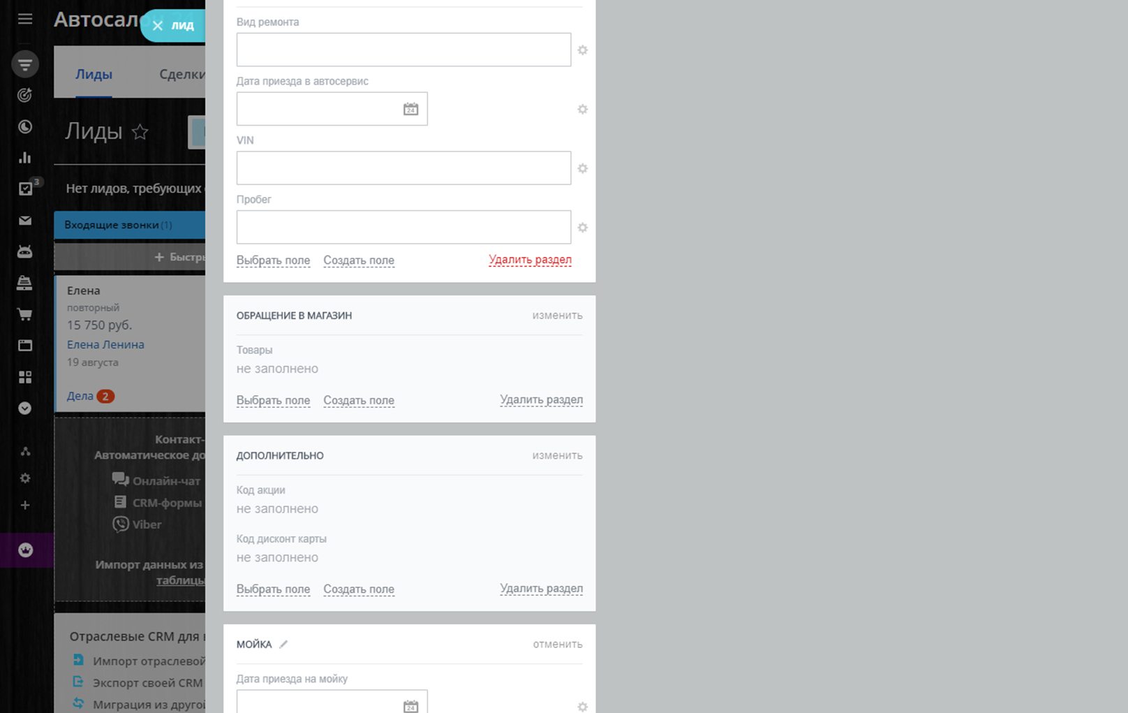 Уже настроены 3 направления для сделок – ремонт авто, магазин и мойка. Информация, заполненная у лида, автоматически попадает в соответствующие поля в сделке.