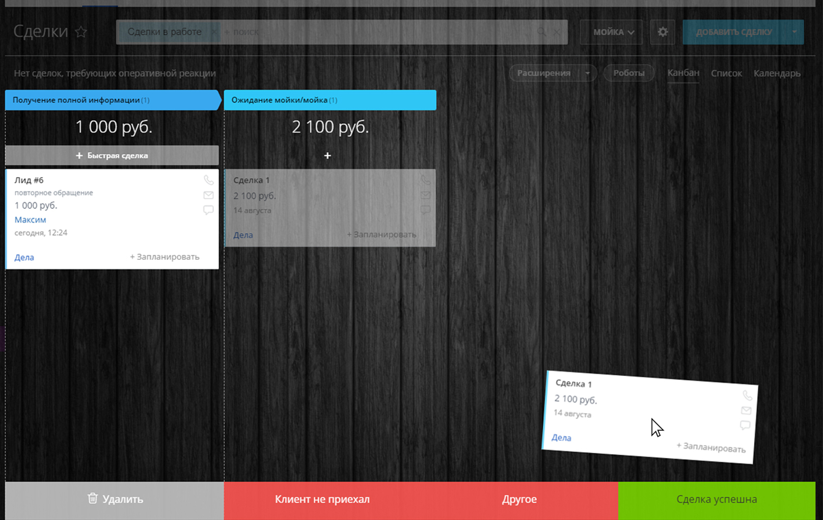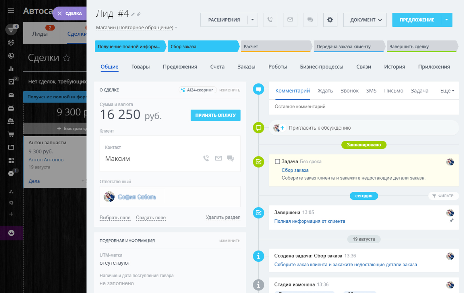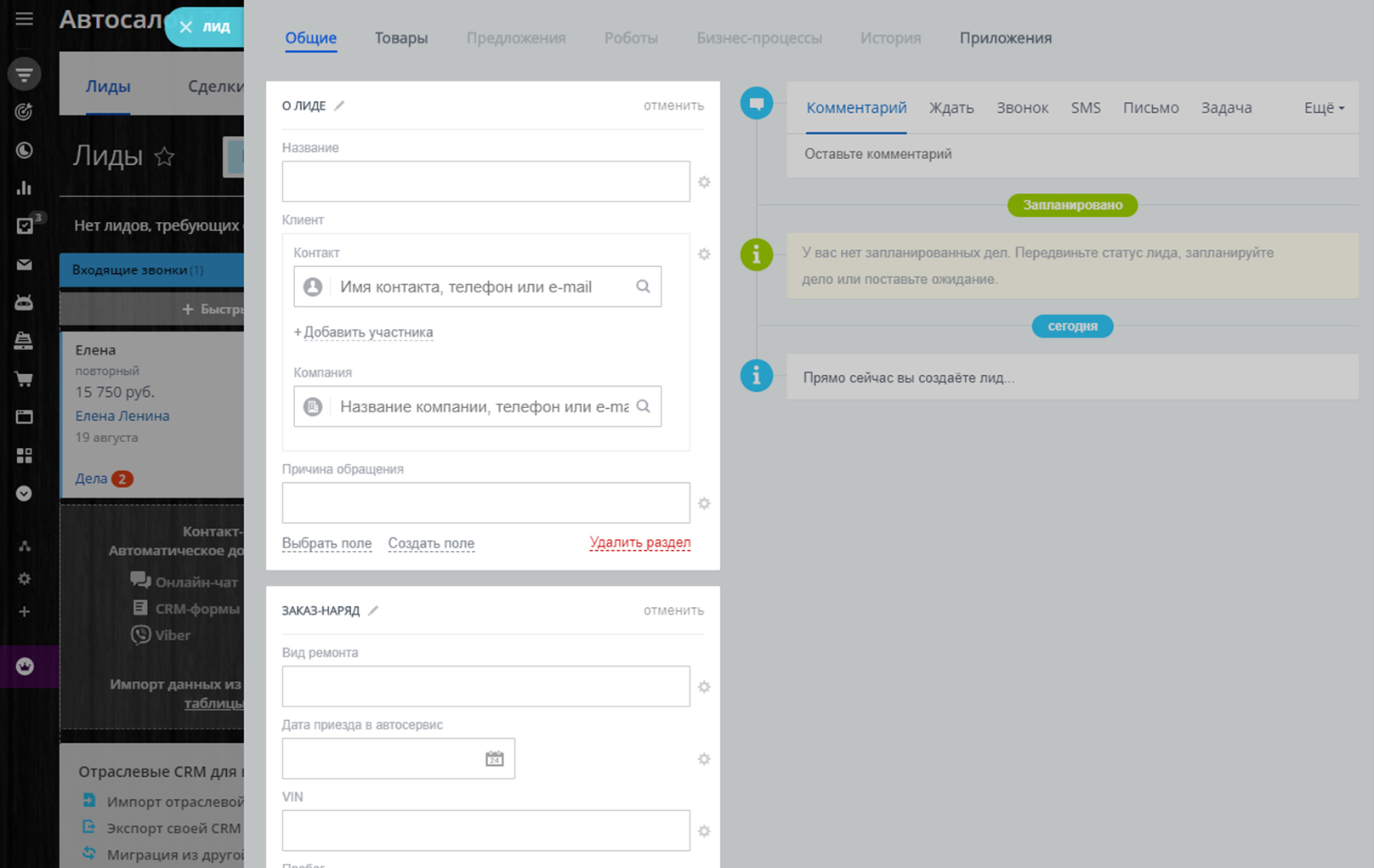 Уже настроены 3 направления для сделок – ремонт авто, магазин и мойка. Информация, заполненная у лида, автоматически попадает в соответствующие поля в сделке.