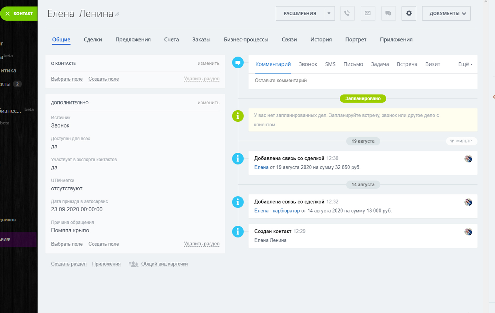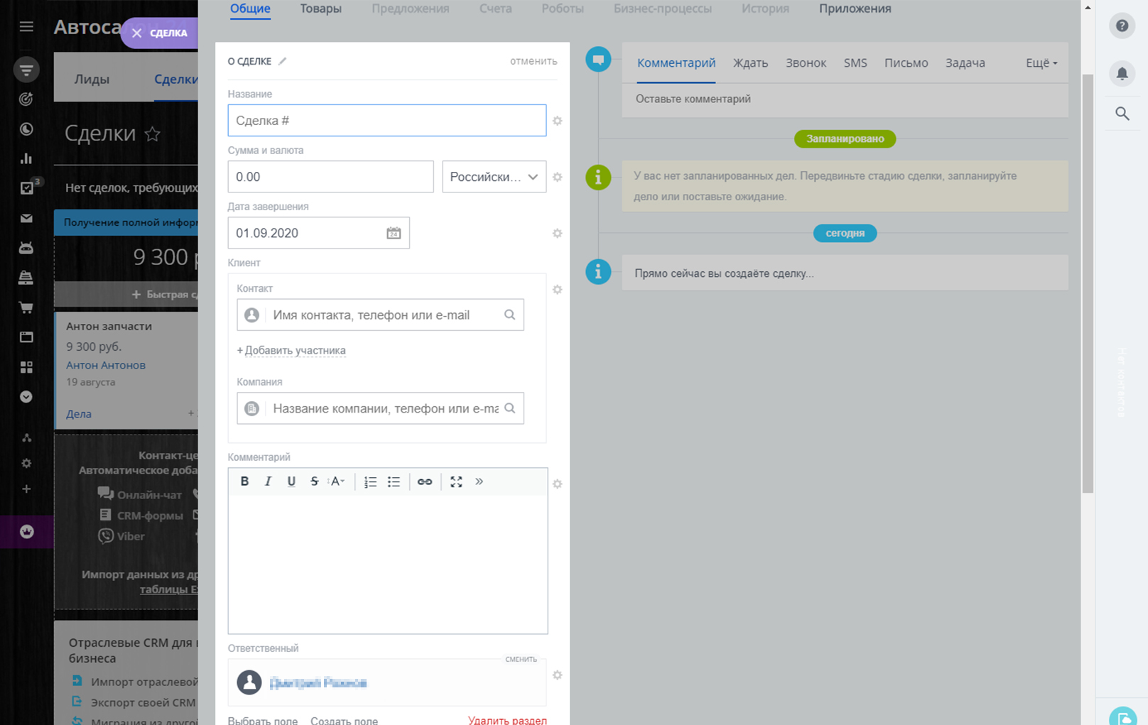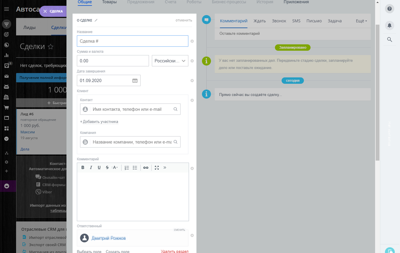 Все ранее внесенные данные о вашем клиенте и его обращении переносятся из лида в сделку. Также появляются дополнительные поля, относящиеся к данному направлению.