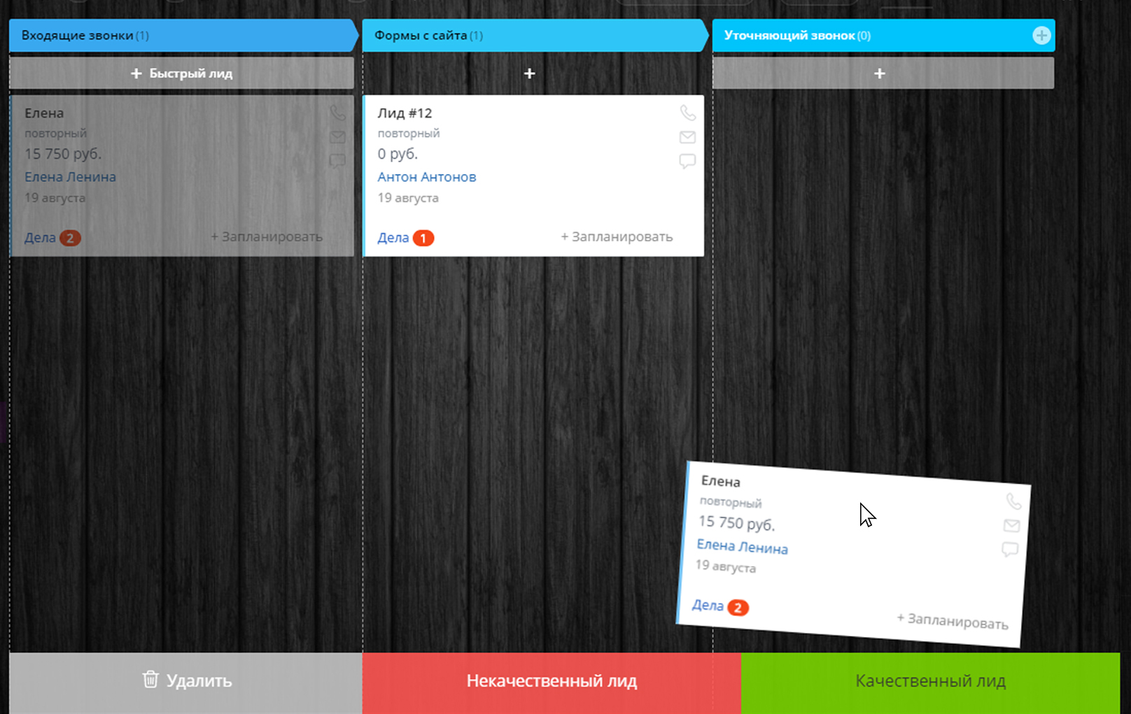 Для лидов, полученных из входящих звонков и из форм сайта, настроены триггеры – автоматический переход лида на первую стадию после обращения в компанию.