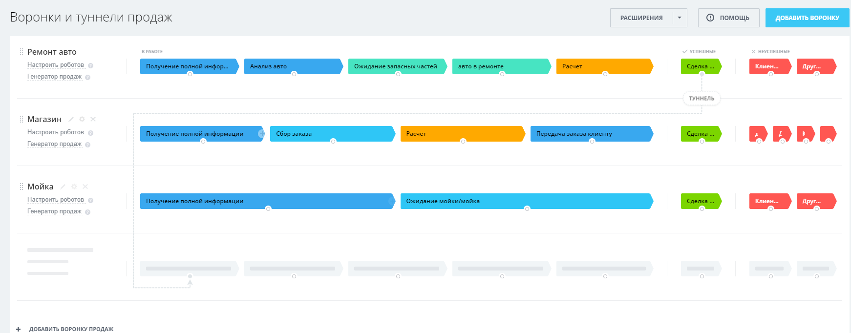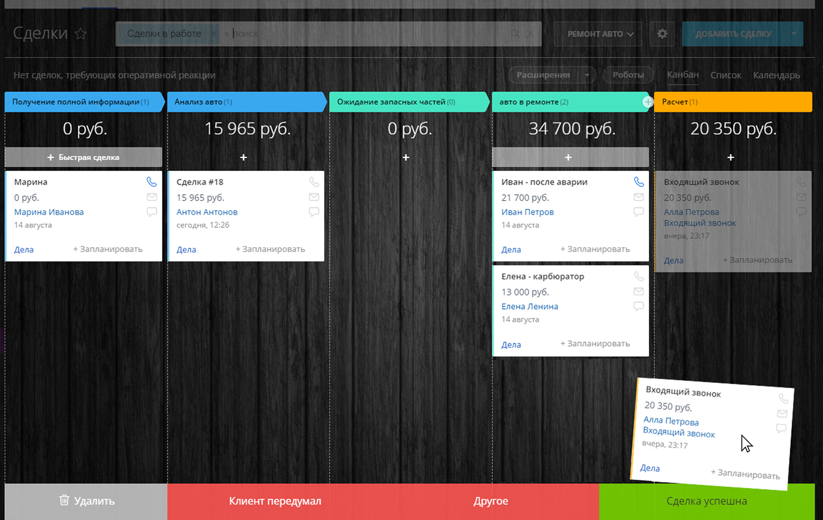 На стадии обработки лида происходит перераспределение услуг по направлениям – ремонт авто, магазин, мойка.