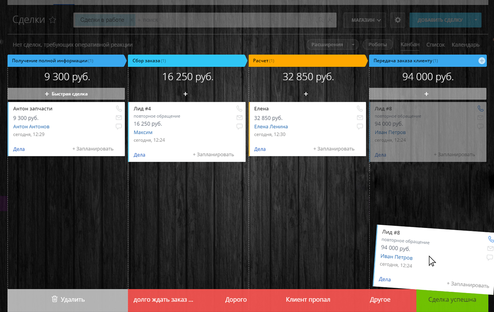 При перемещении на эту стадию система сразу же информирует ответственного менеджера о необходимости заказа деталей и сбора заказа.
