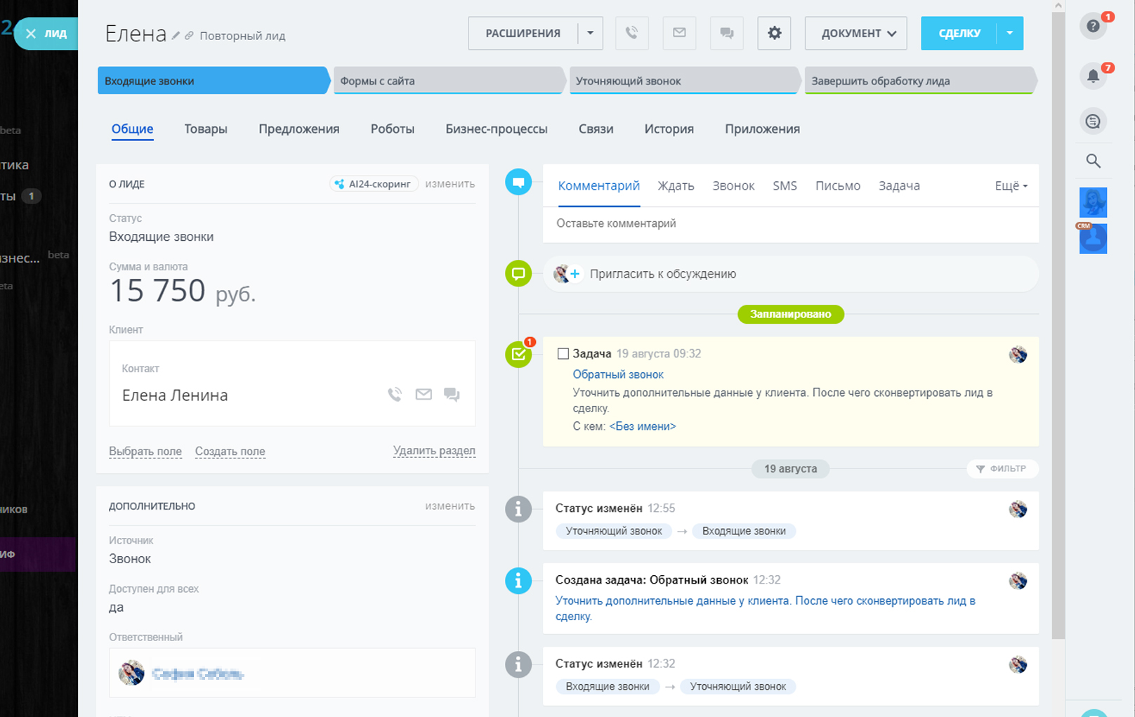 Если полученной от клиента информации оказалось недостаточно, можно перенести лид на стадию «Уточняющий звонок», после чего автоматически будет поставлена задача «Обратный звонок» для уточнения всех необходимых деталей.