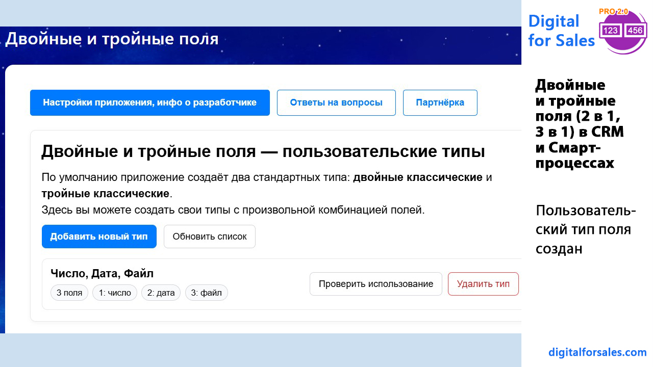 2. После установки вам будет доступно создание пользовательских полей с типом “Двойные поля” и "Тройные поля". Название поля – на ваше усмотрение.