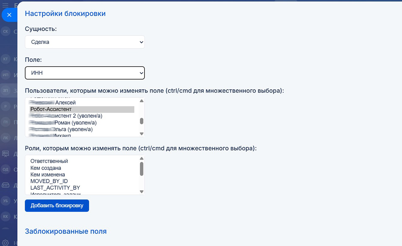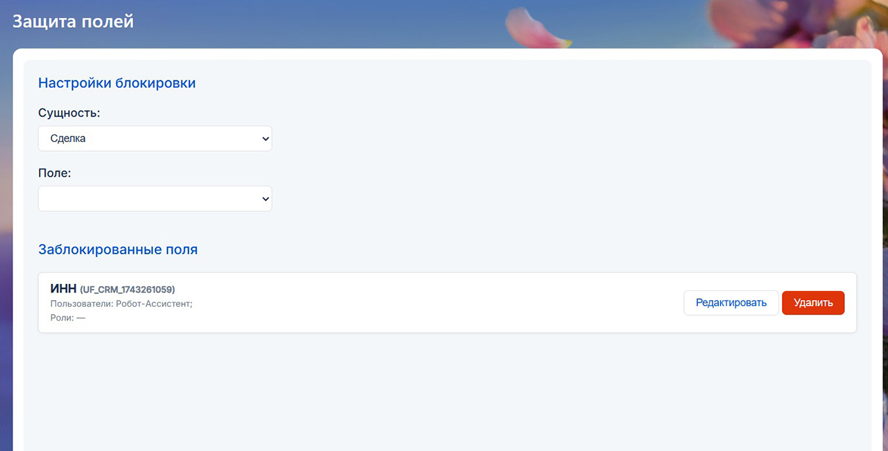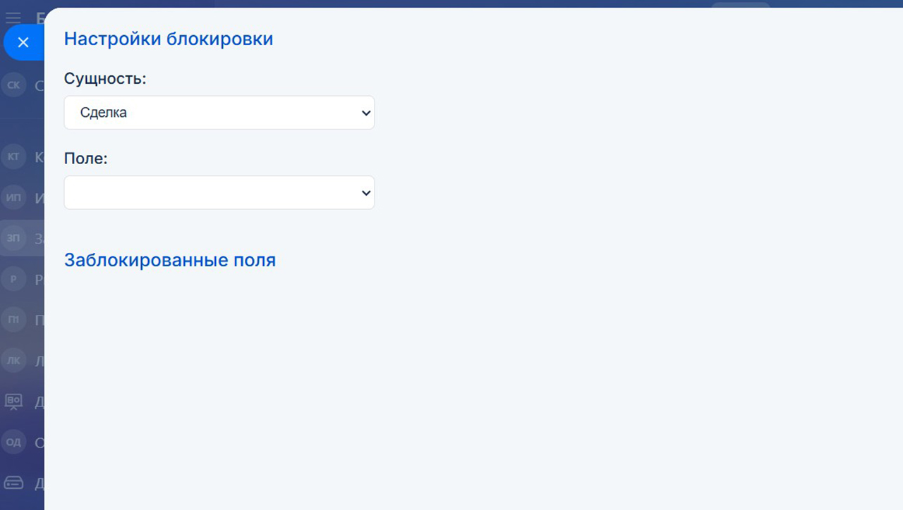 2. Перейдите в настройки приложения. Выберите сущность (Лид, Сделка, Контакт, Компания), а затем укажите, какое поле защитить и кому разрешено его редактировать.