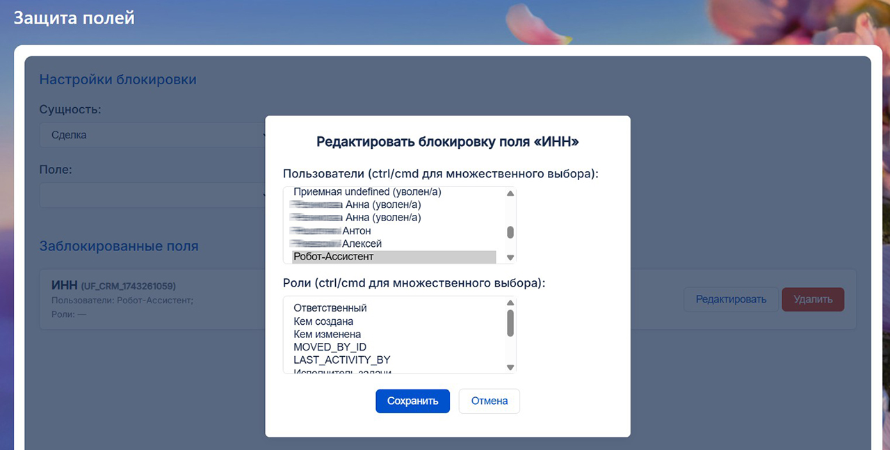 Защита выбранных полей от изменения. Настраиваемый список сотрудников, которым разрешено их редактирование