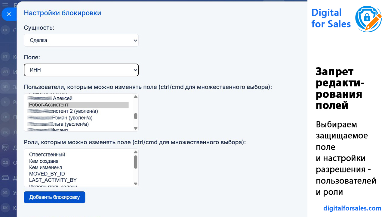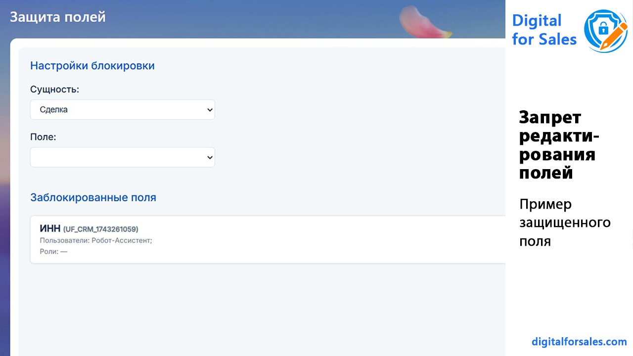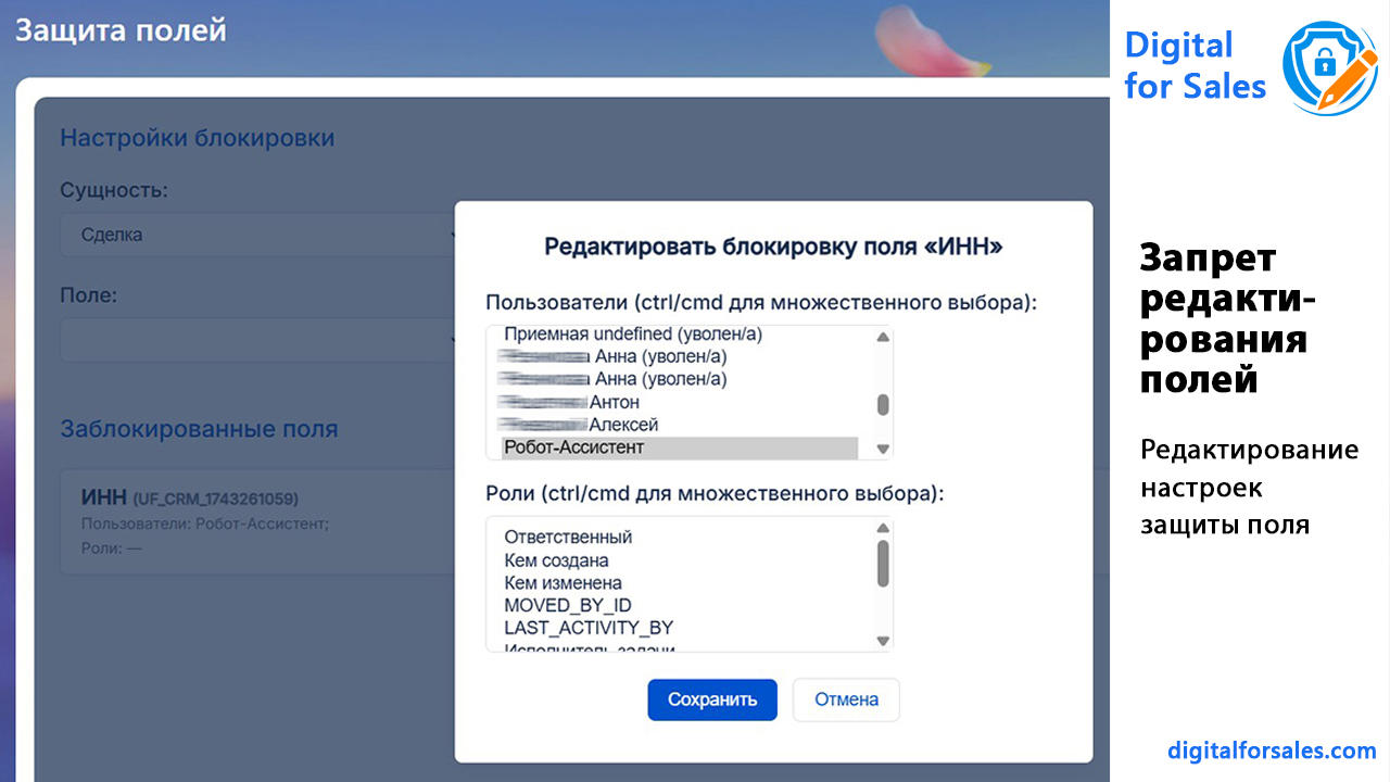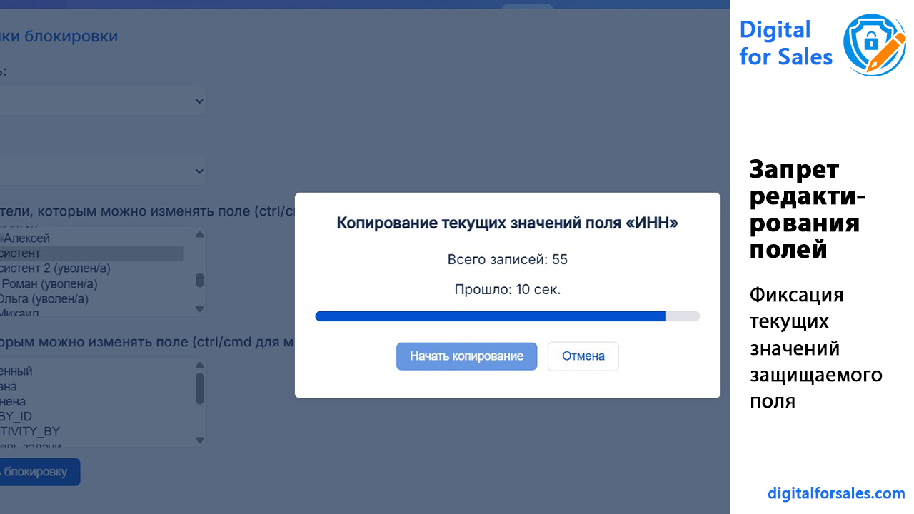 Укажите, какие поля следует защитить, кому можно их редактировать (конкретные фамилии и/или роли). Зафиксируйте текущие значения этих полей – и с этого момента начнется магия…