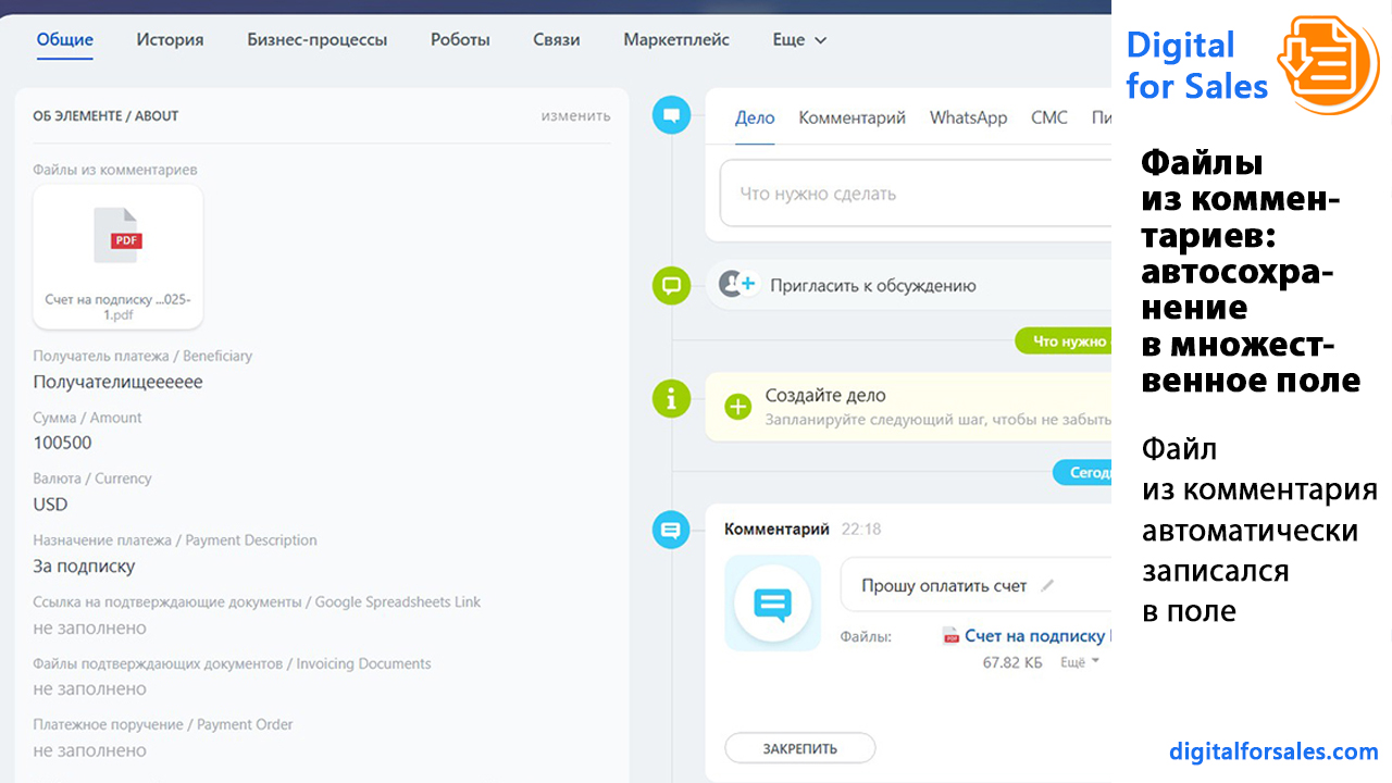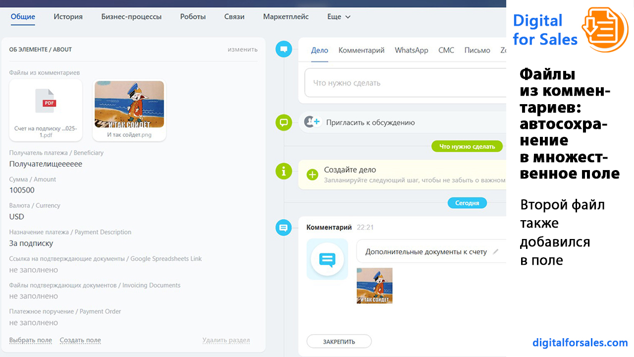 Активити «Файлы из комментариев»: переносит вложения комментариев сделки в отдельное поле.