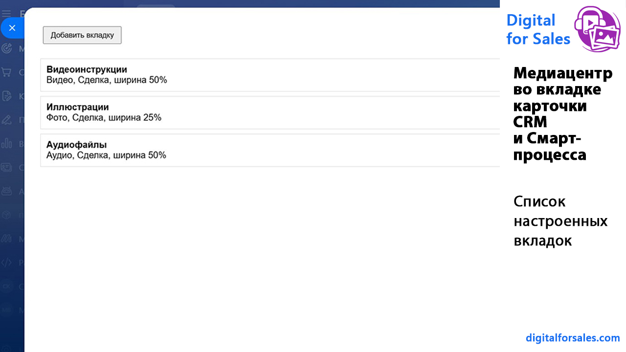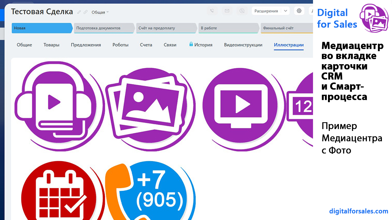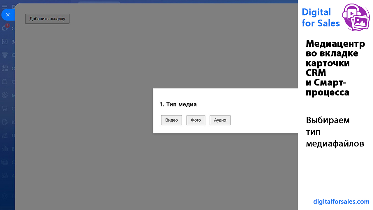 Текстовая версия видео: https://digitalforsales.com/case/mediacentr-vo-vkladke-kartochki-crm-i-smart-processa