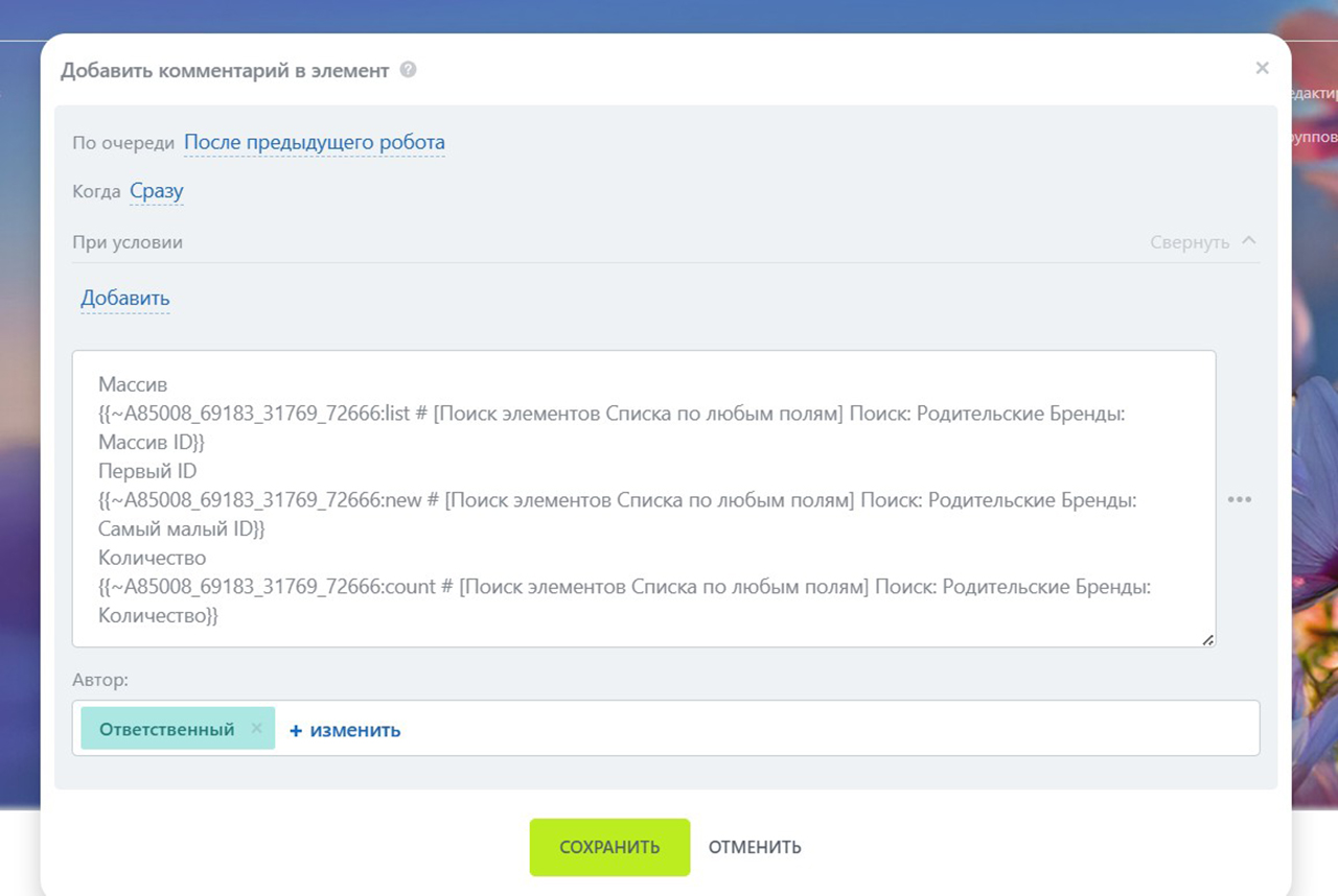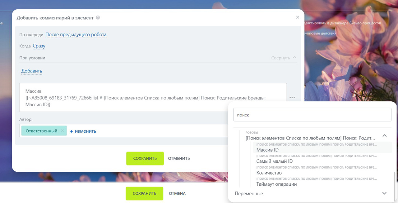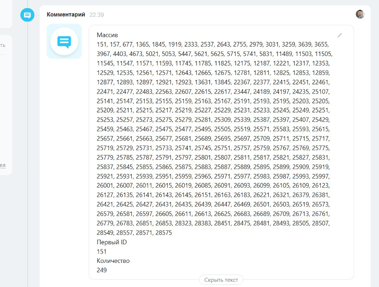 – Массив ID найденных элементов. Его можно использовать в последующих роботах, умных сценариях, шаблонах и дизайнере бизнес-процессов (например, в итераторе);