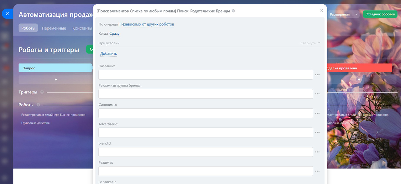 Важно, что роботы доступны в любом разделе портала: в лидах, сделках, умных сценариях, шаблонах бизнес-процессов и, разумеется, списках.