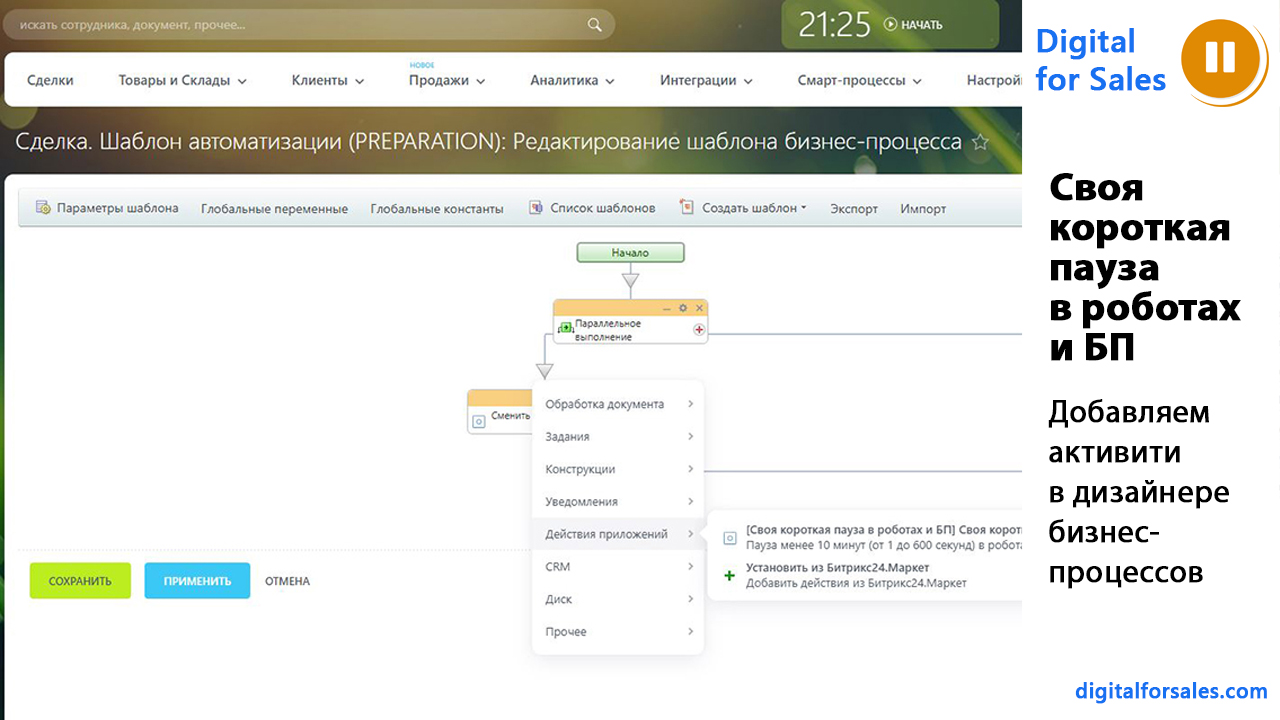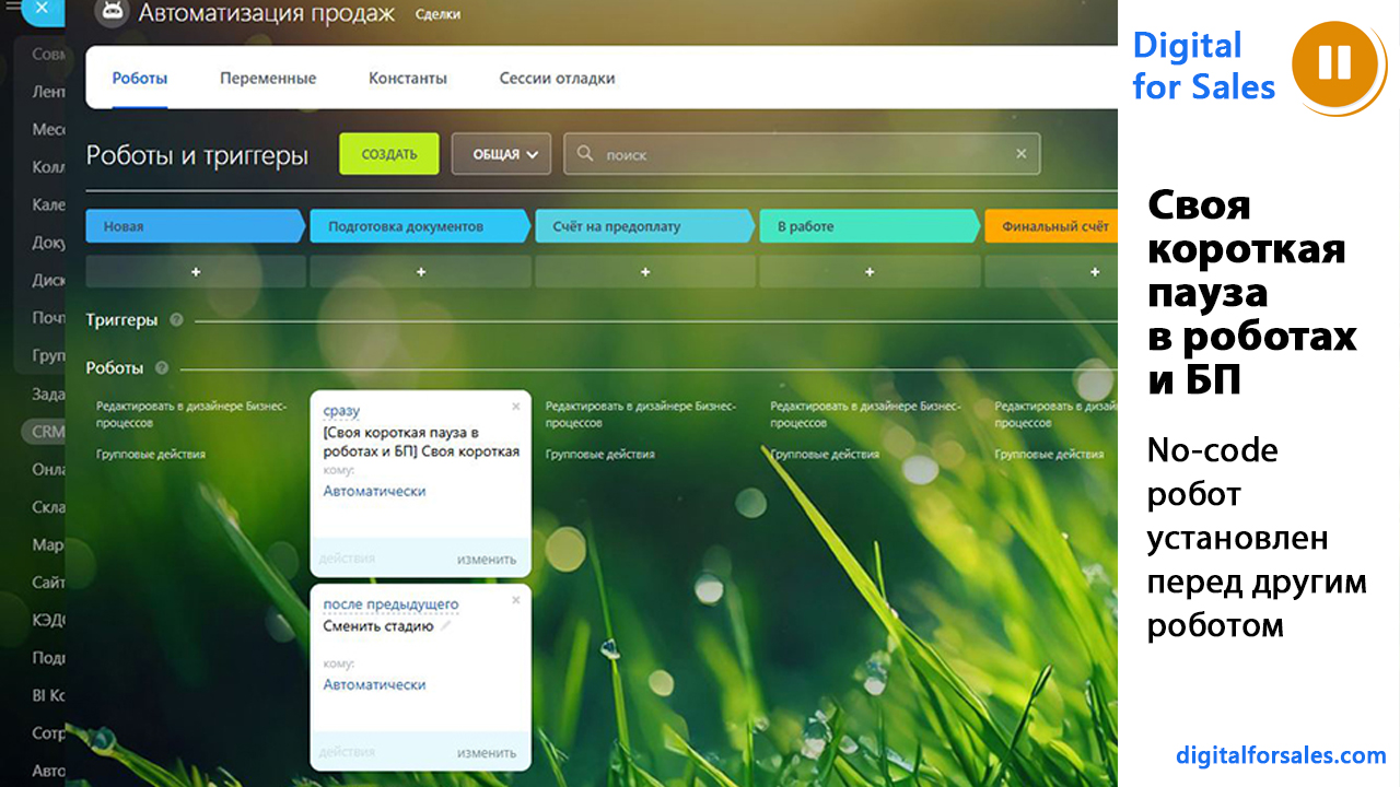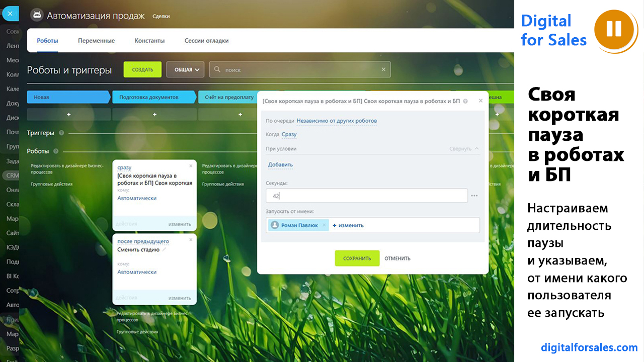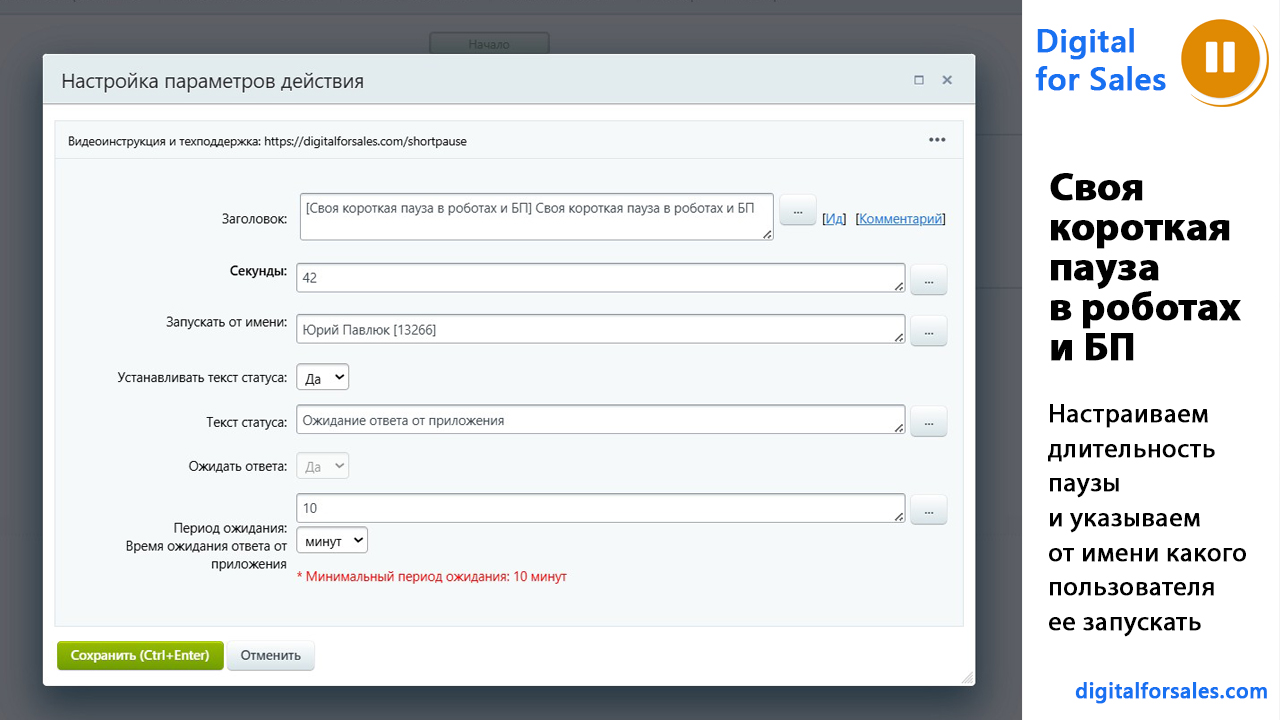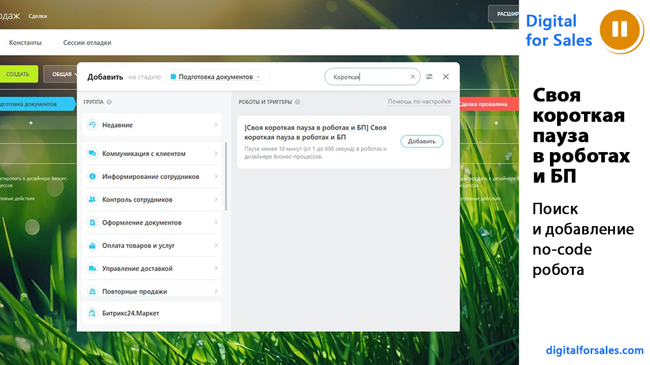 Это удобный способ добавить в Битрикс24 то, чего часто не хватает в штатной автоматизации: короткую и точную паузу в секундах.