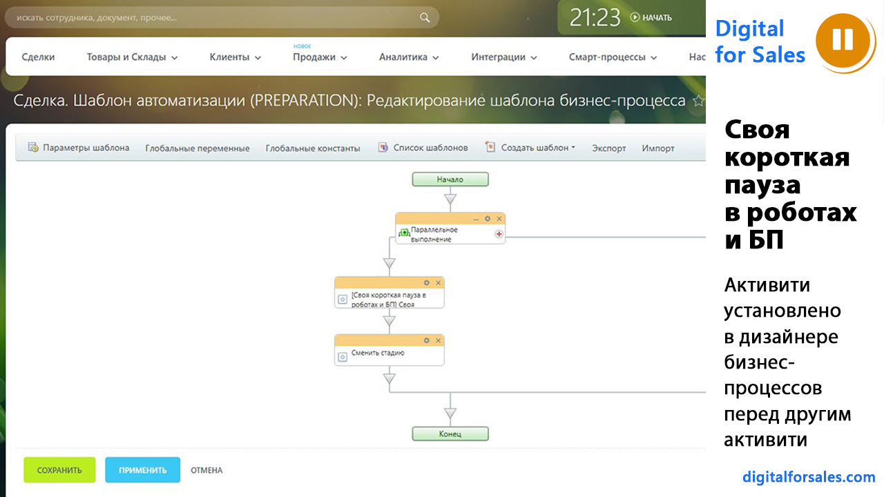 3. Вставьте Паузу в необходимое место в Роботах или Дизайнере бизнес-процессов.