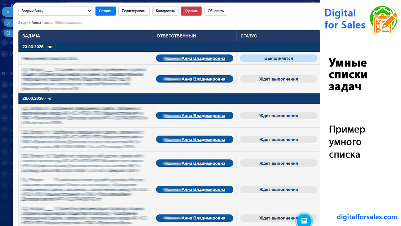 Наше приложение позволяет собирать списки с вашими собственными настройками, компонуя задачи по росту дедлайнов и исходя из потребностей вашего бизнеса.