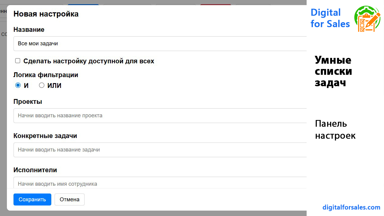 Указать, какие задачи должны попадать в умный список, с помощью полей “Проекты”, “Конкретные задачи”, “Исполнители”.
