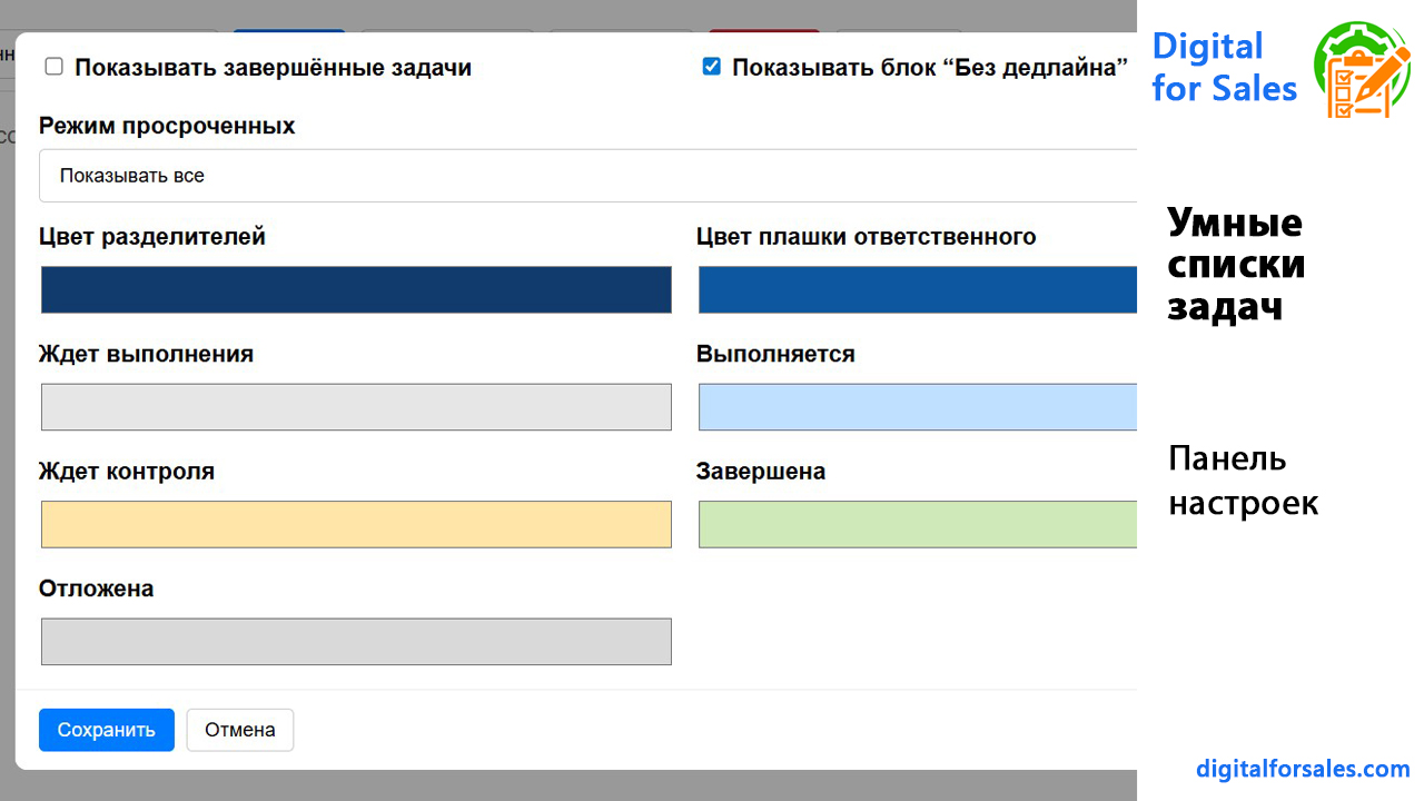 Указать, следует ли показывать завершенные задачи и блок задач без дедлайна.