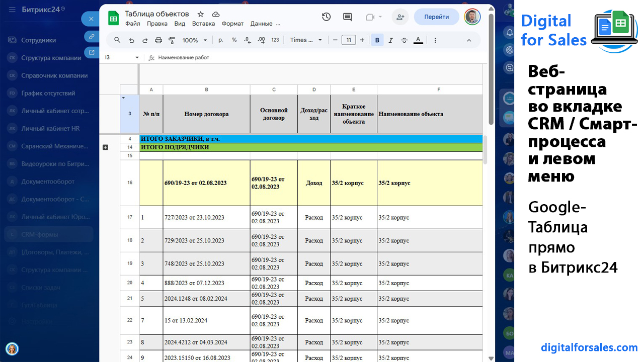 Да, приложение хорошо подходит для работы с Google Docs и Google Sheets в Битрикс24. Это один из самых частых сценариев использования: можно открыть таблицу, документ или форму прямо внутри карточки CRM или через левое меню, чтобы сотрудник не искал ссылку вручную и не терял рабочий контекст.