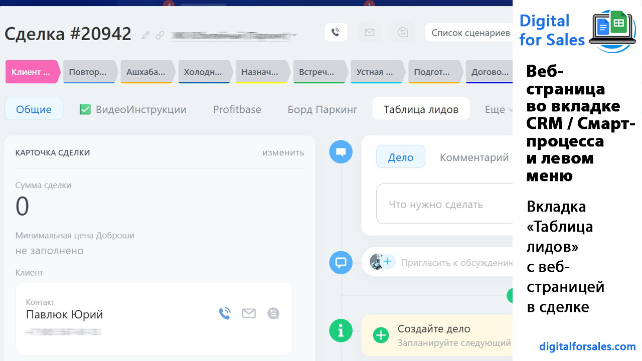 – добавление веб-страницы во вкладку лида