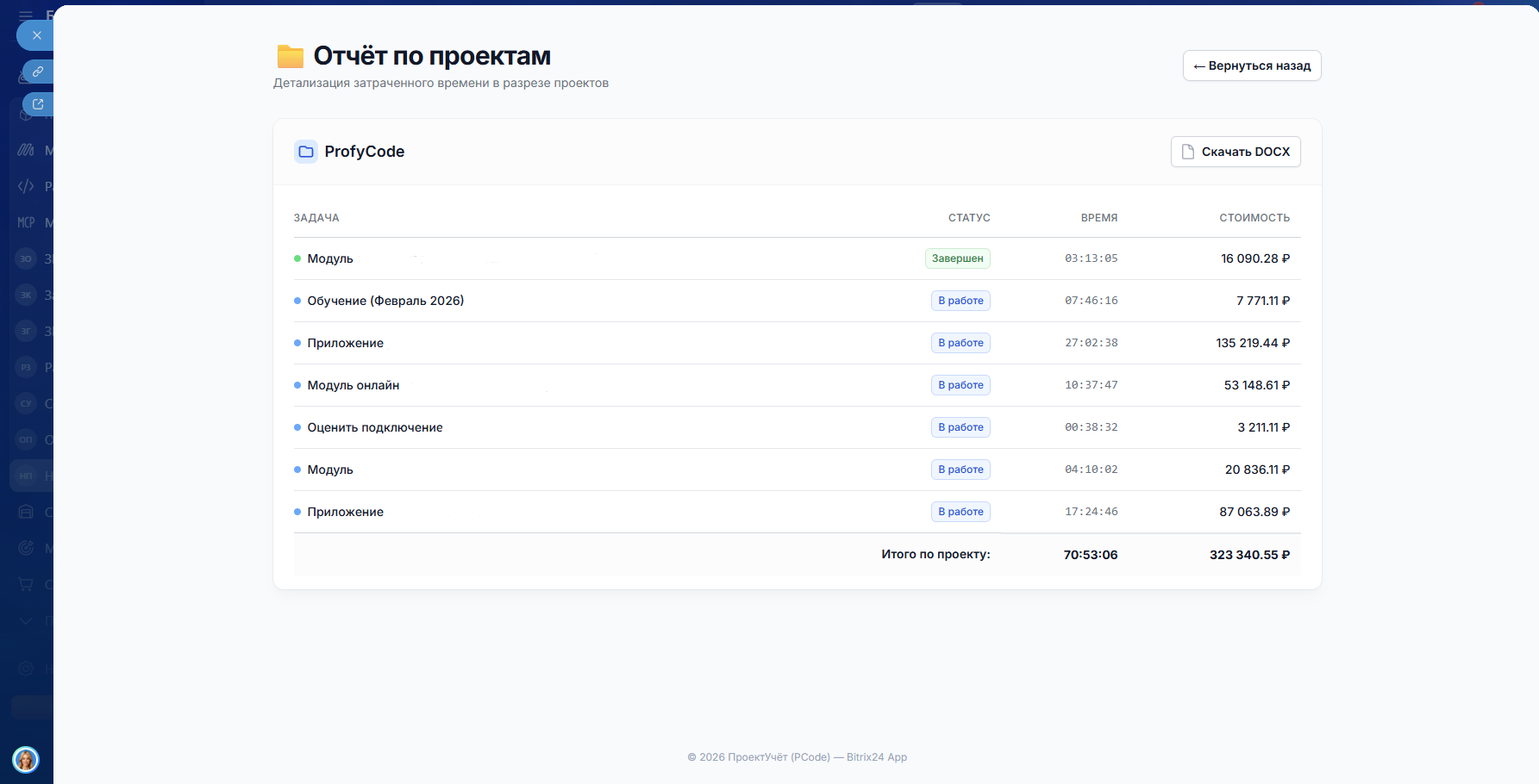 - Получаете детальный отчёт: задачи, часы, стоимость, итоги по каждому проекту