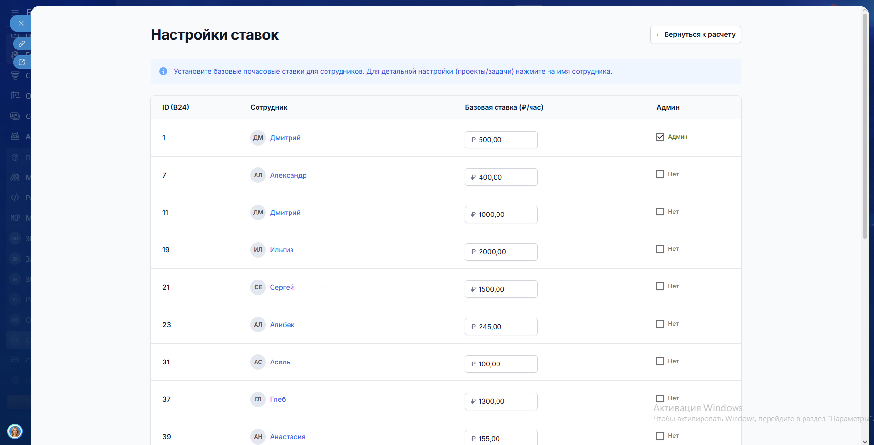 - Базовую ставку: Почасовая оплата для каждого специалиста.