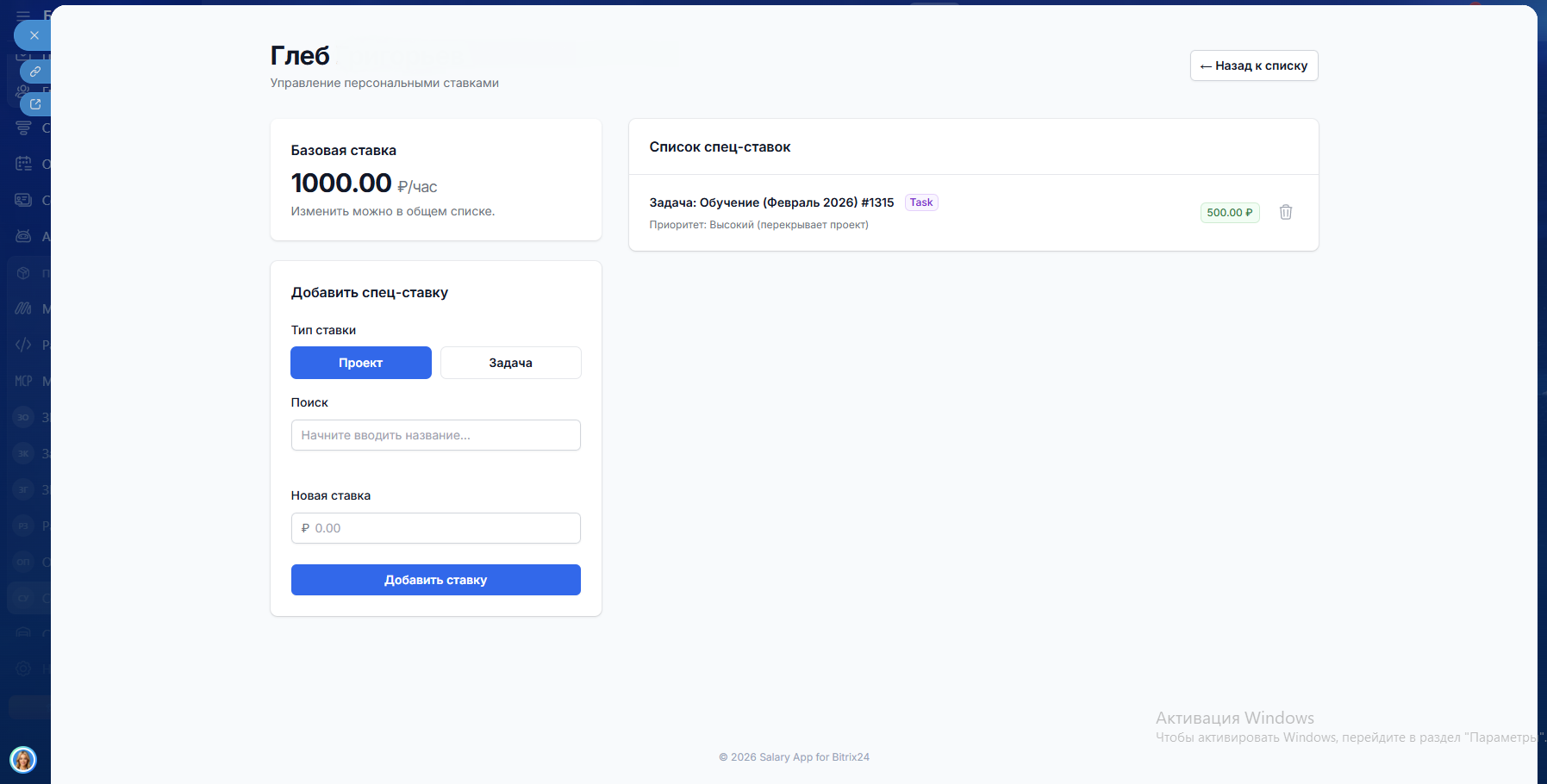 - Ставку за задачу: Особо сложная задача требует уникальной оценки? Задайте стоимость часа конкретно для неё.