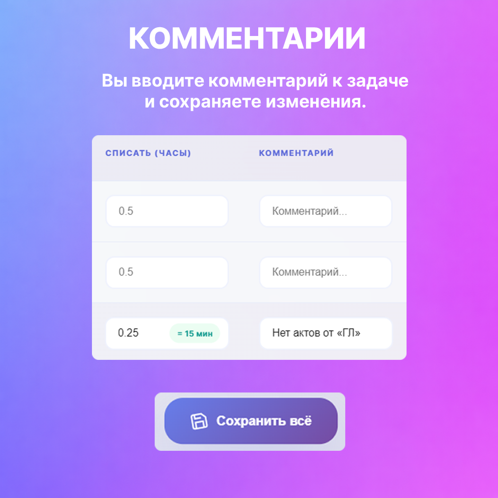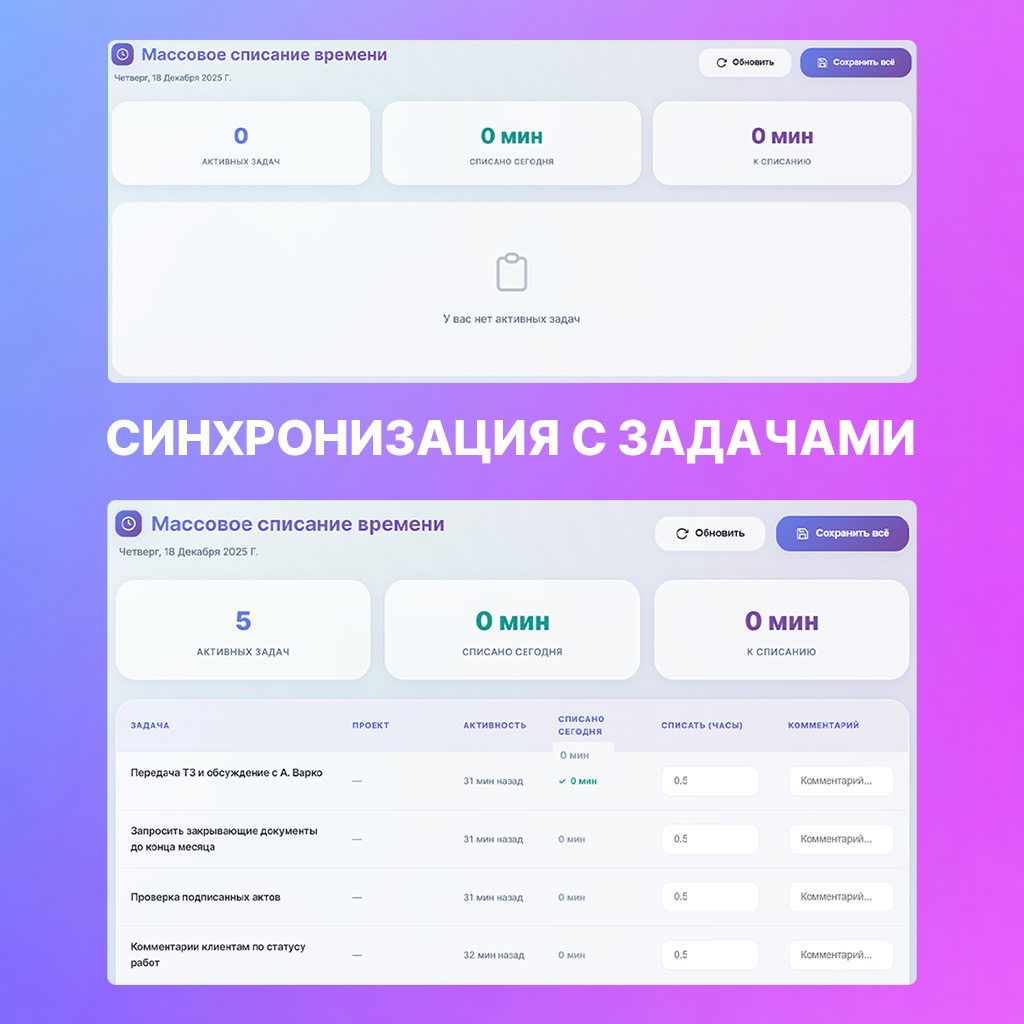 Модуль отображает активные задачи пользователя за текущий день и уже списанное время. Вы просто вводите количество часов и, при необходимости, добавляете комментарий — все изменения сразу синхронизируются с задачами в Битрикс24.