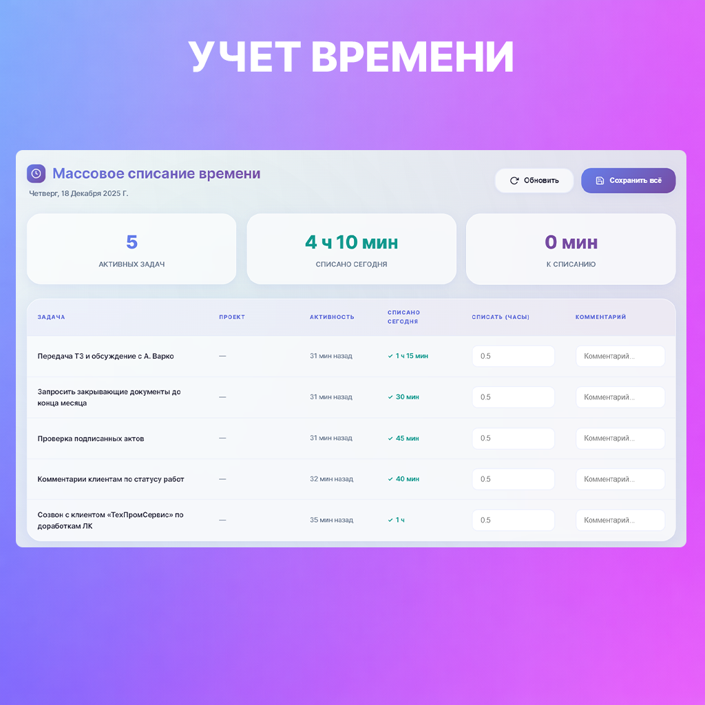 Модуль подходит для аккаунт-менеджеров, проджект-менеджеров и команд, которым важно быстро и аккуратно закрывать учет времени в конце дня.