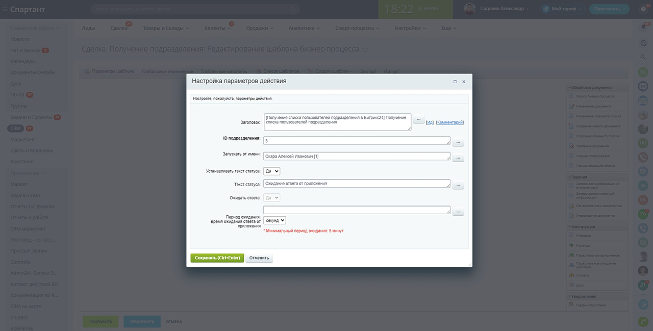 - Ввести код необходимого подразделения можно вручную (его можно найти в административной части в разделе Подразделения) или передать через переменную типа "Привязка к разделам инфоблоков", инфоблок "Подразделения".