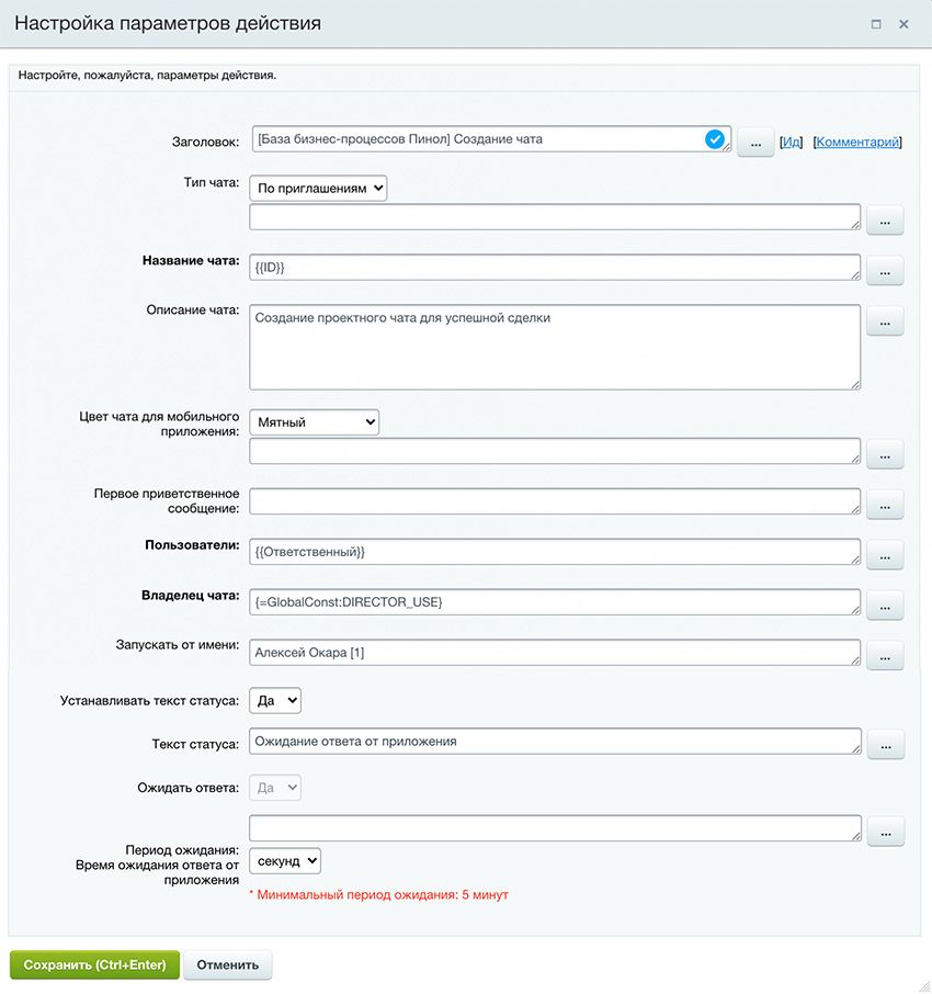 Приложение предоставляет возможность создать групповой чат на определенном этапе бизнес-процесса. Например, если в сделке меняется статус счета на "Оплачен", сделка автоматически переходит на другую стадию и после этого автоматически создается групповой чат с руководителем и ответственным за сделку для обсуждения. Вместо сделки может быть использована любая сущность.