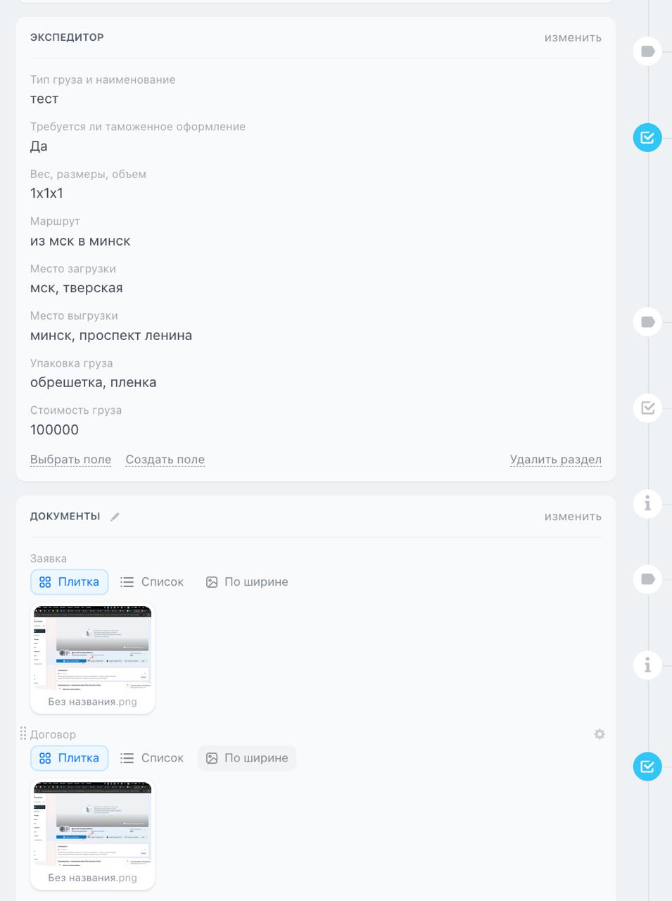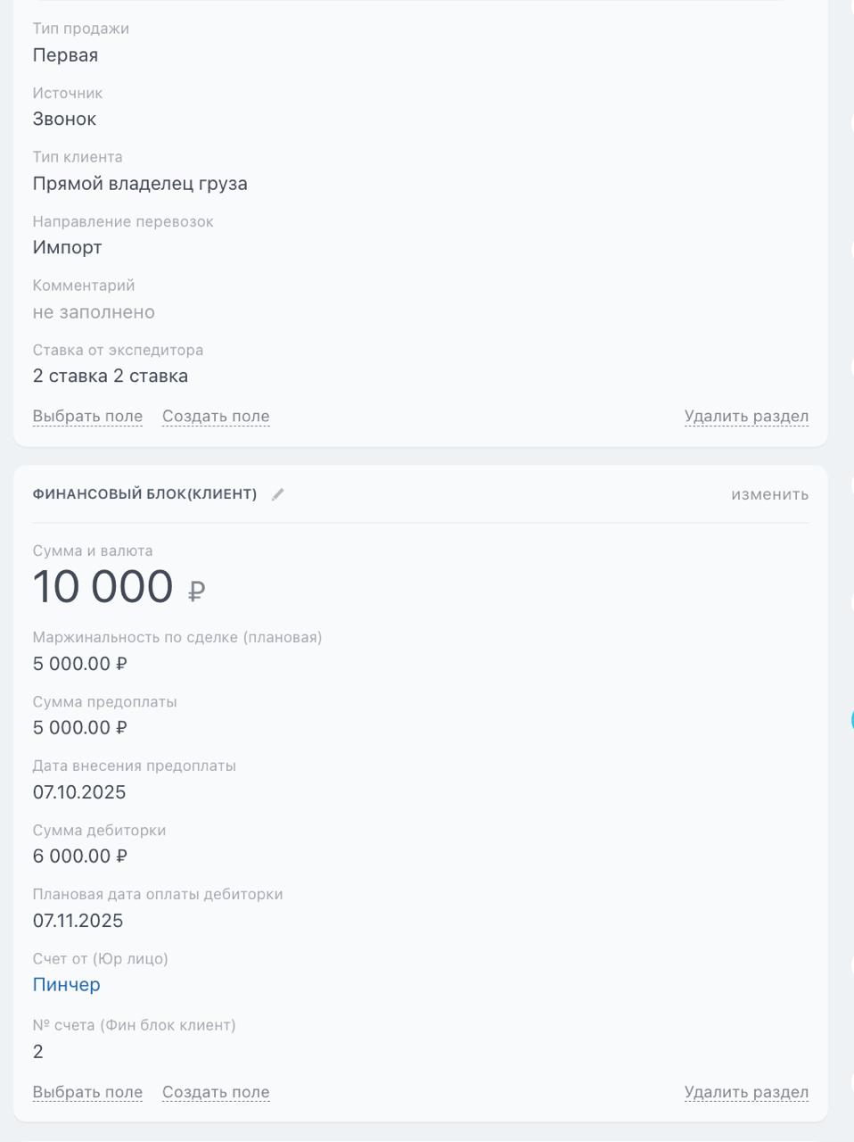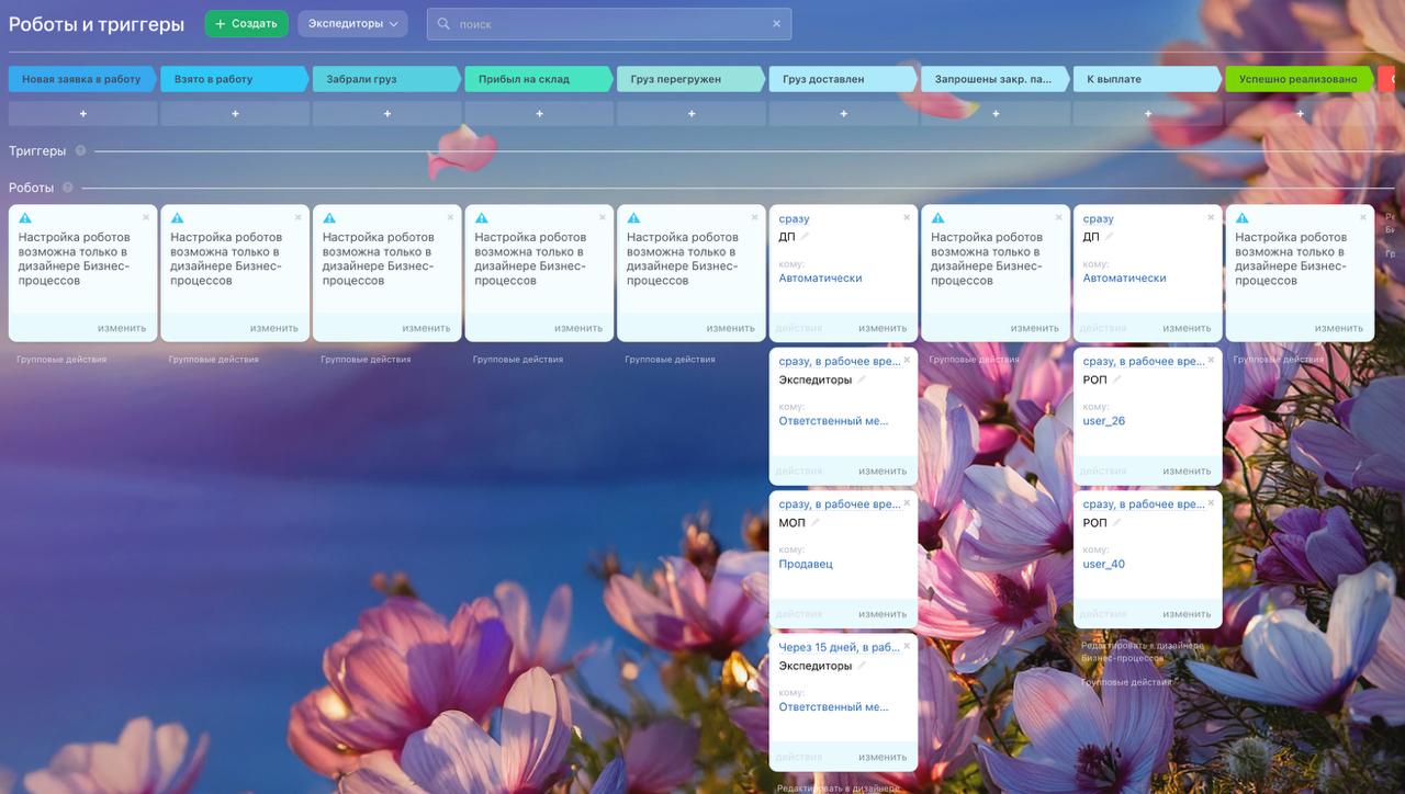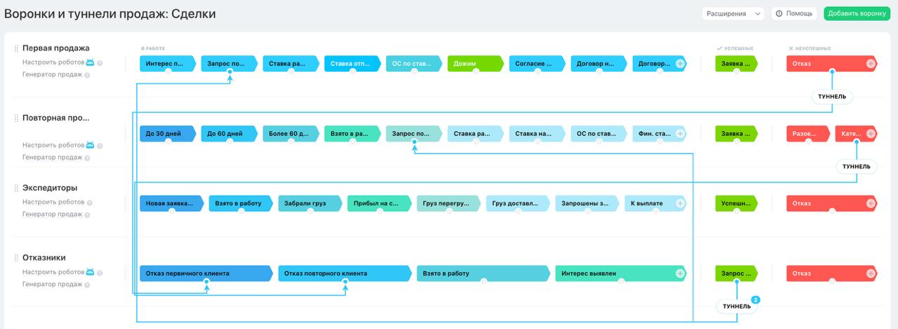 Основная рабочая воронка для отдела экспедиторов. Главная задача воронки - довести перевозку до завершения. Именно в этой воронке фиксируются все данные по перевозке, по оплатам партнерам.