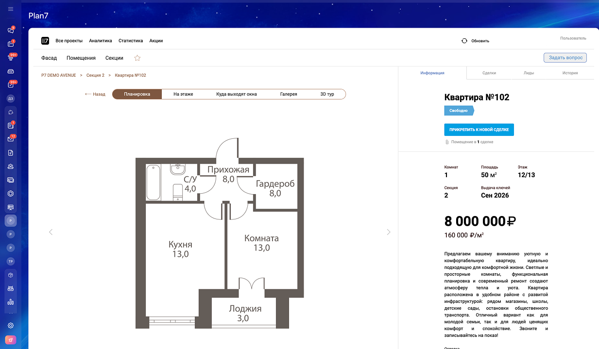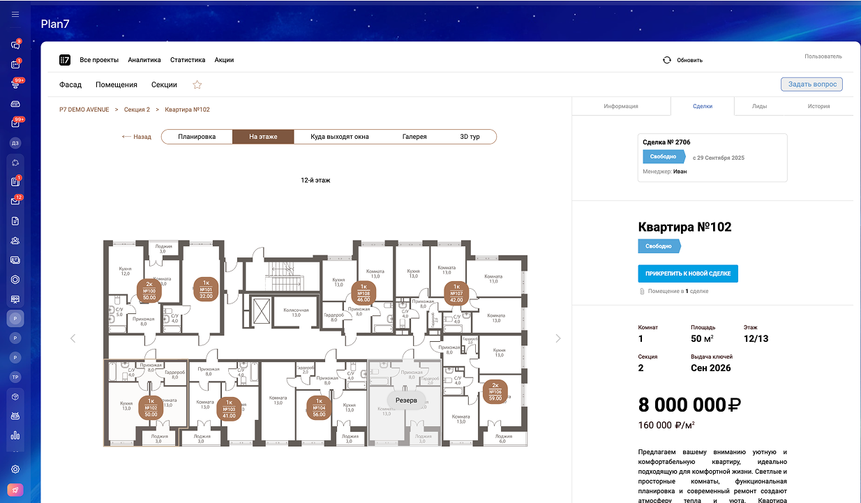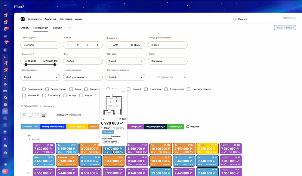 Plan7 - это виджет для создания шахматки новостройки или коттеджного поселка, интеграции ее в Битрикс24, подключение экспорта на порталы недвижимости и Смарт-Каталога на официальный сайт застройщика.