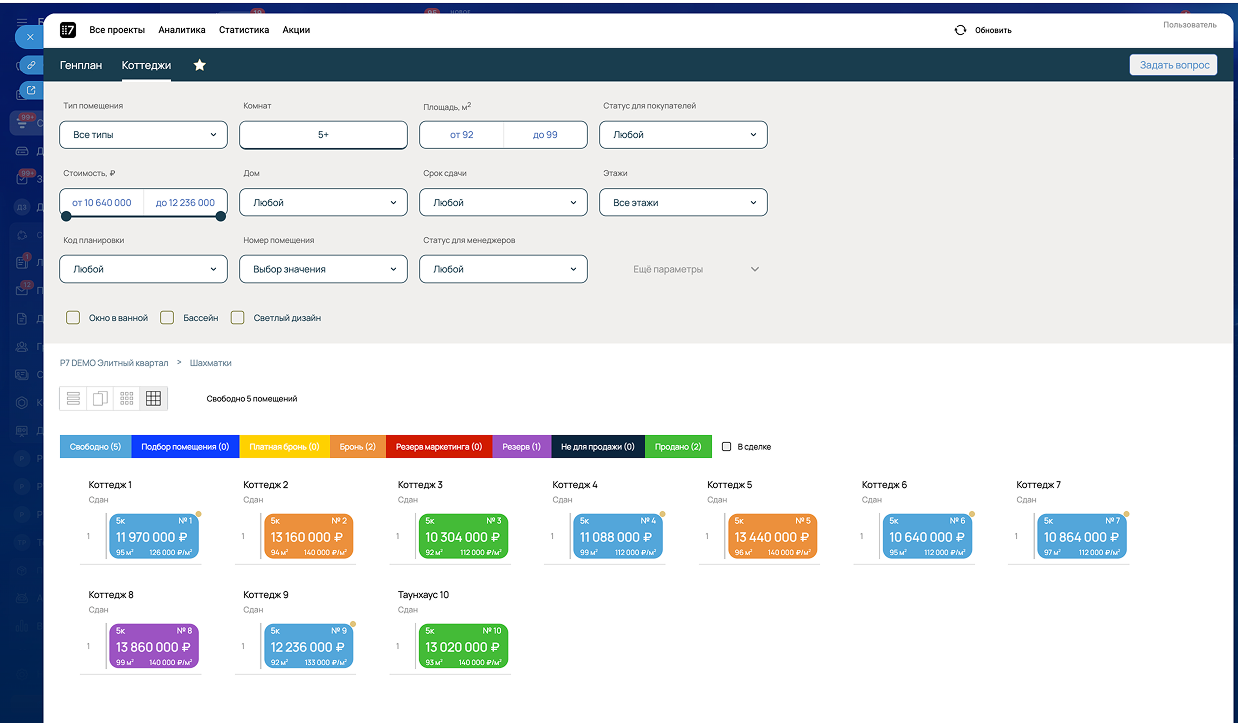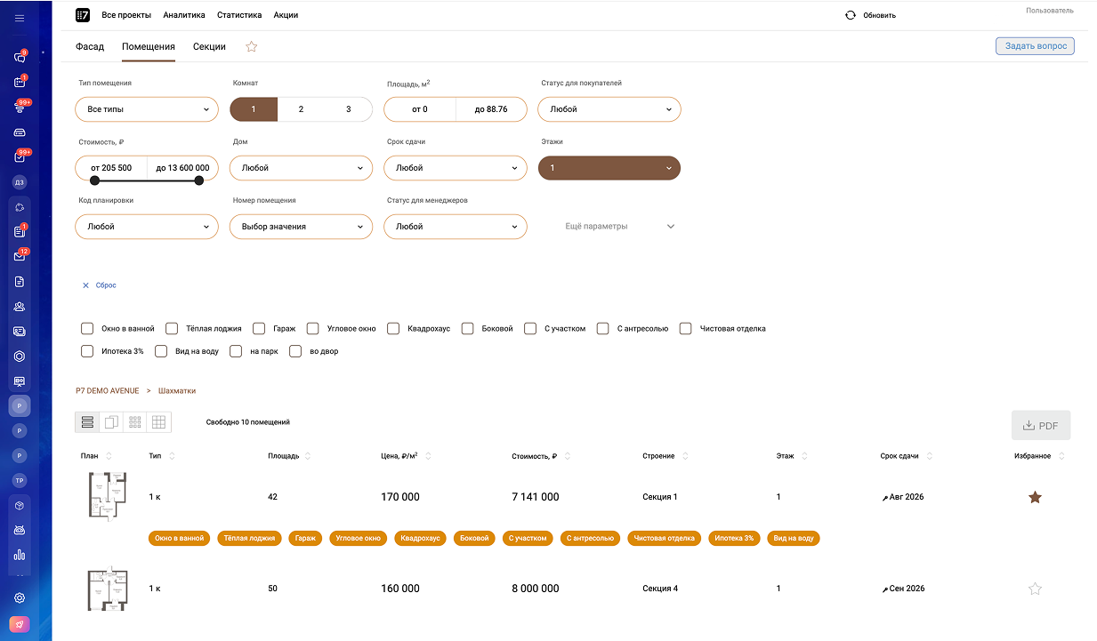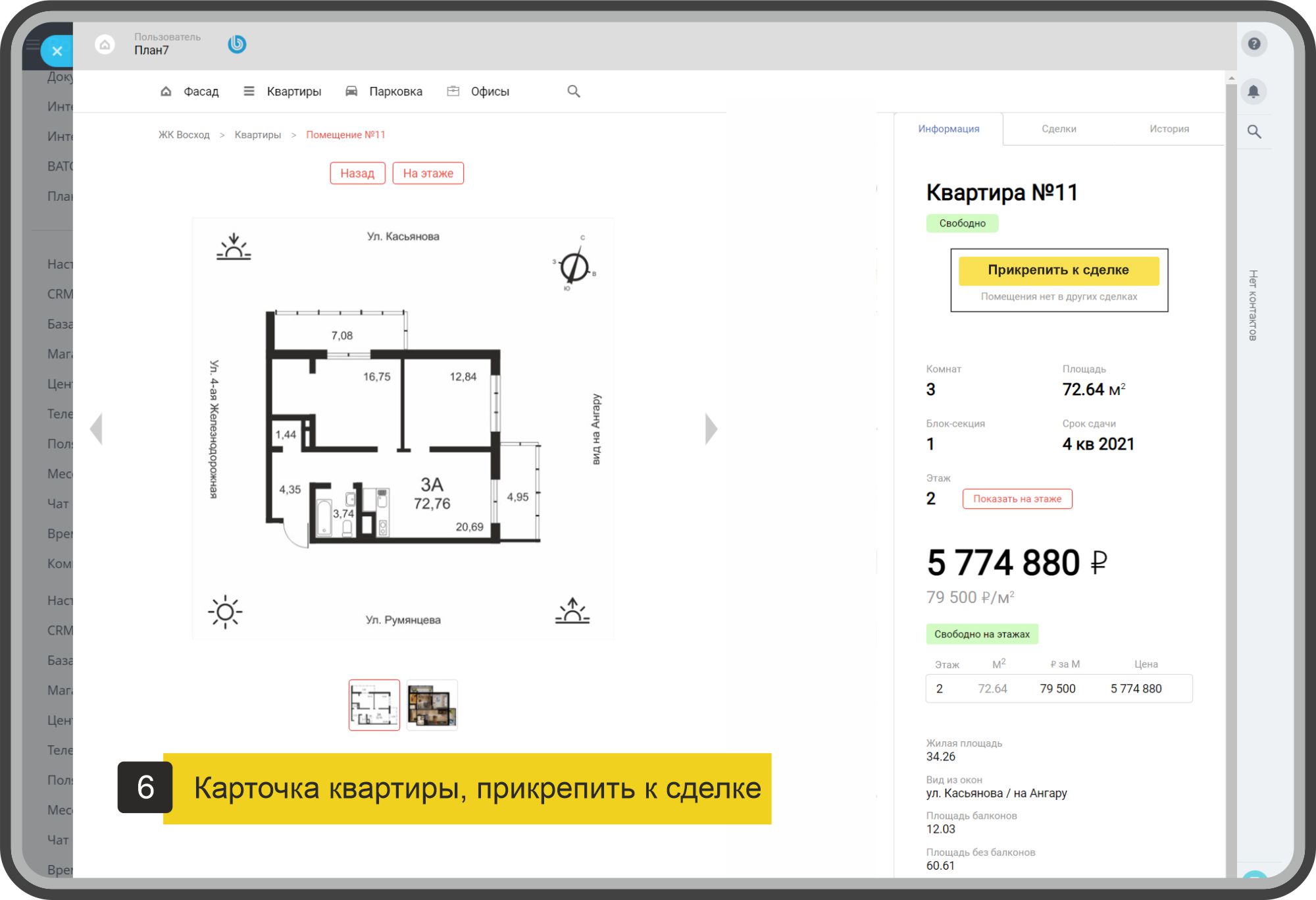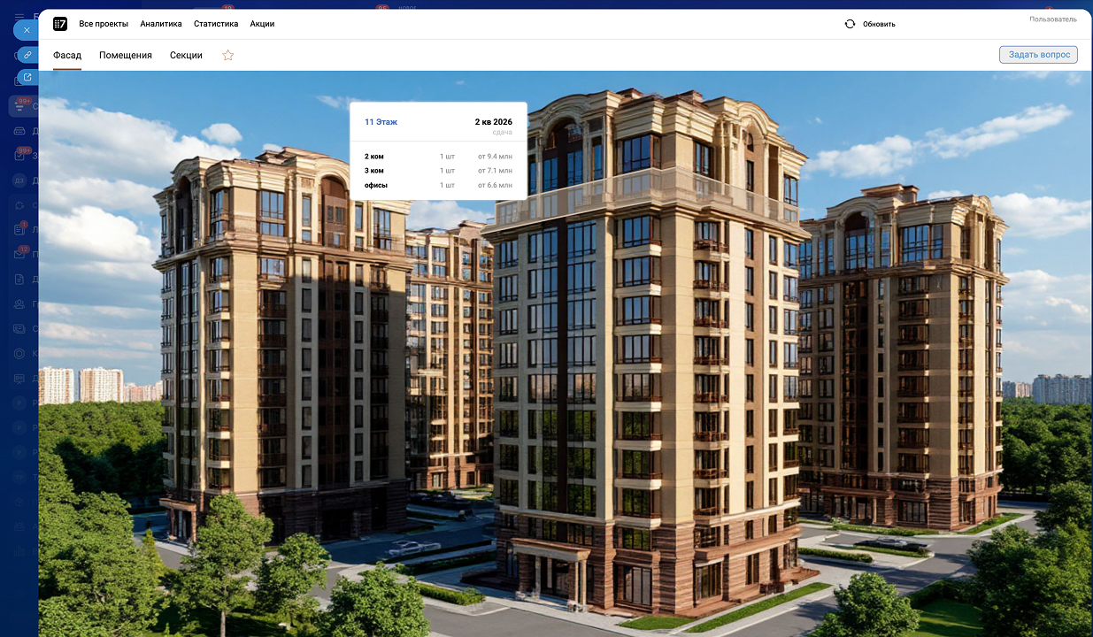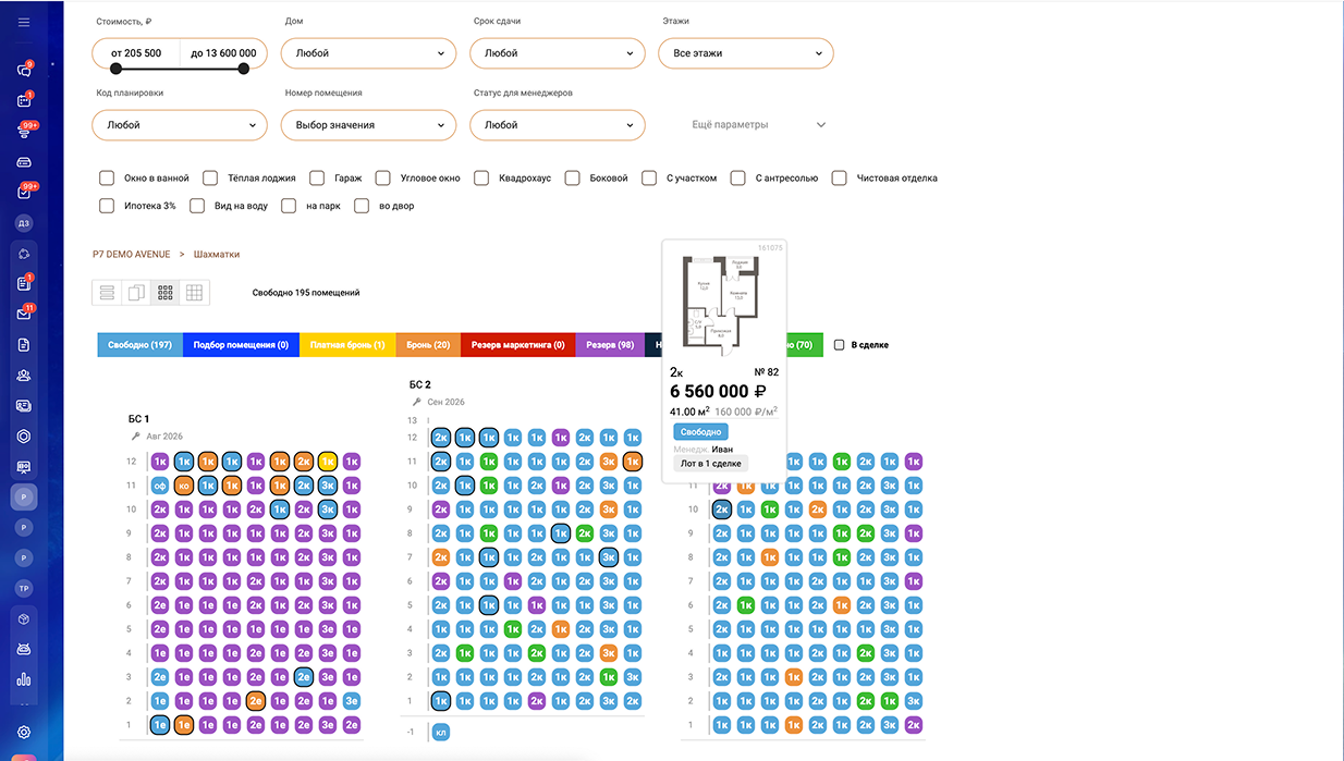 - Подбор квартир по параметрам, на фасаде, на шахматке, на интерактивных планах.